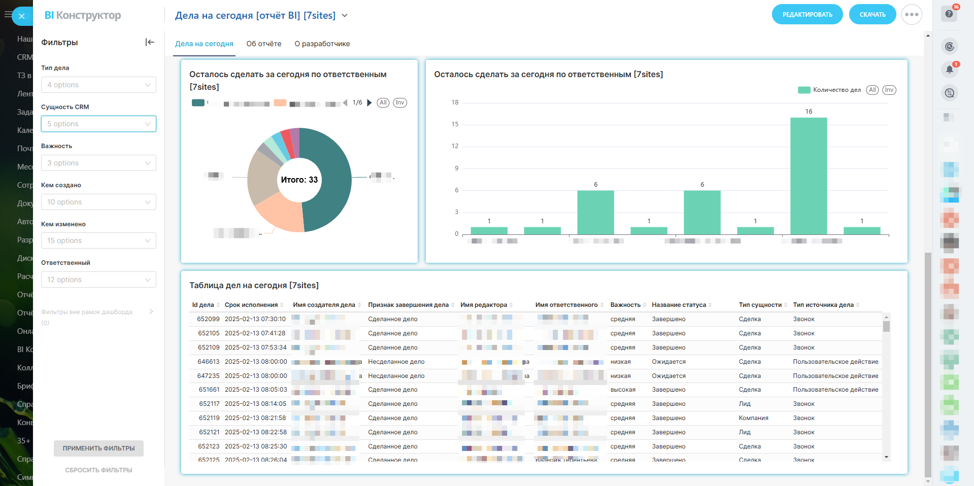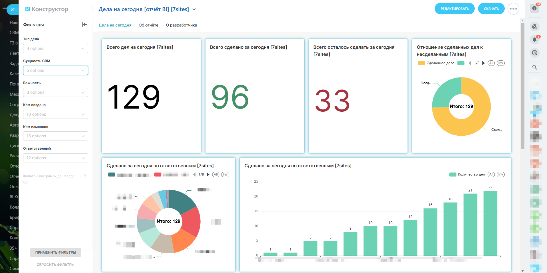 - Гибкая аналитика: Фильтруйте по типу дел, ответственному, важности или автору — выявляйте перегрузки и узкие места за минуты.