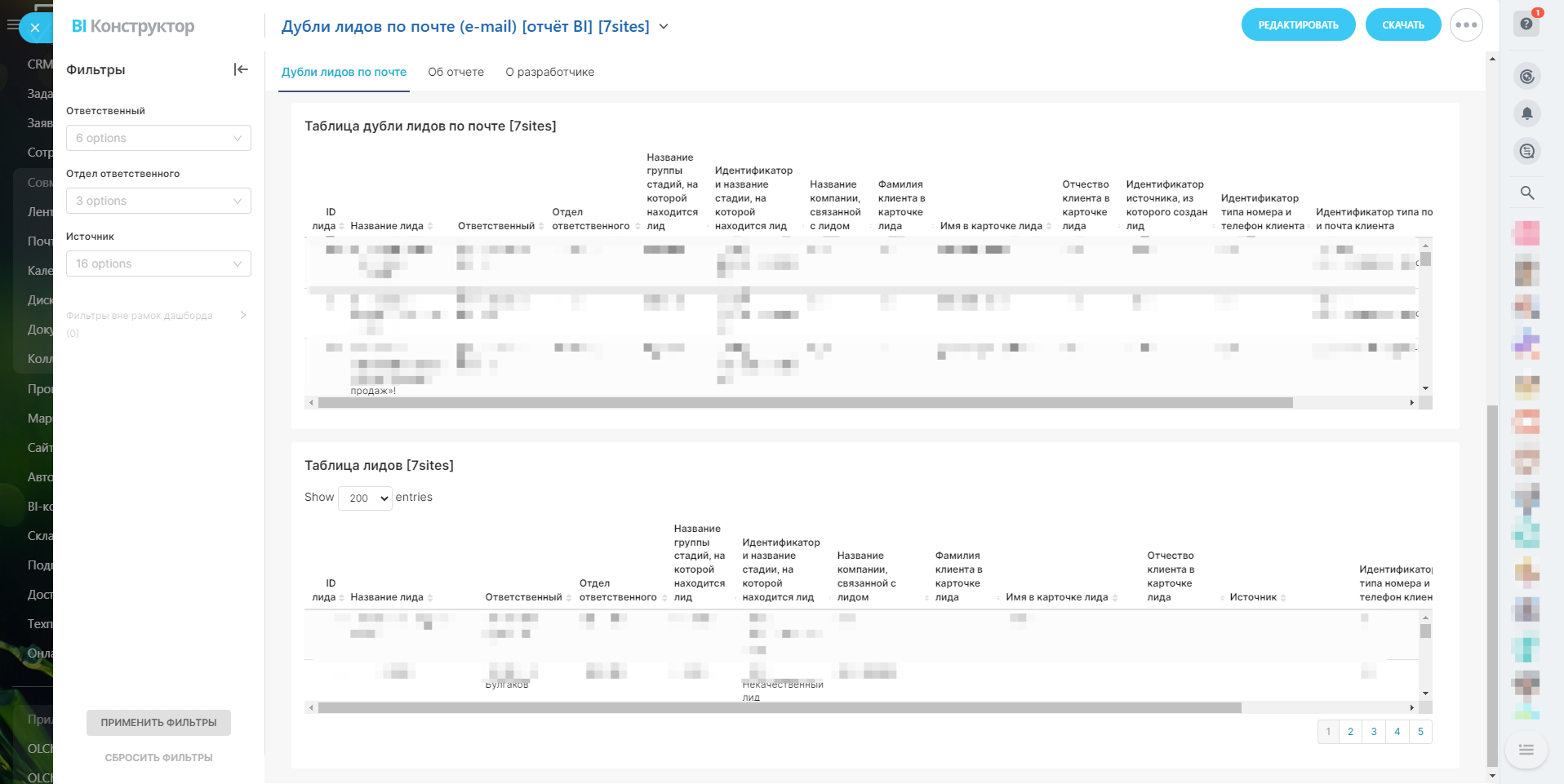 Также стоить обратить внимание: при выгрузке данных в BI-таблицы, такие поля как почта и телефон имеют множественное значение. Это значит что если указано несколько телефонов или несколько E-mail, то в выгрузке они будут перечислены через запятую. Отчёт при этом выведет наличие дублей только при полном совпадении записей.