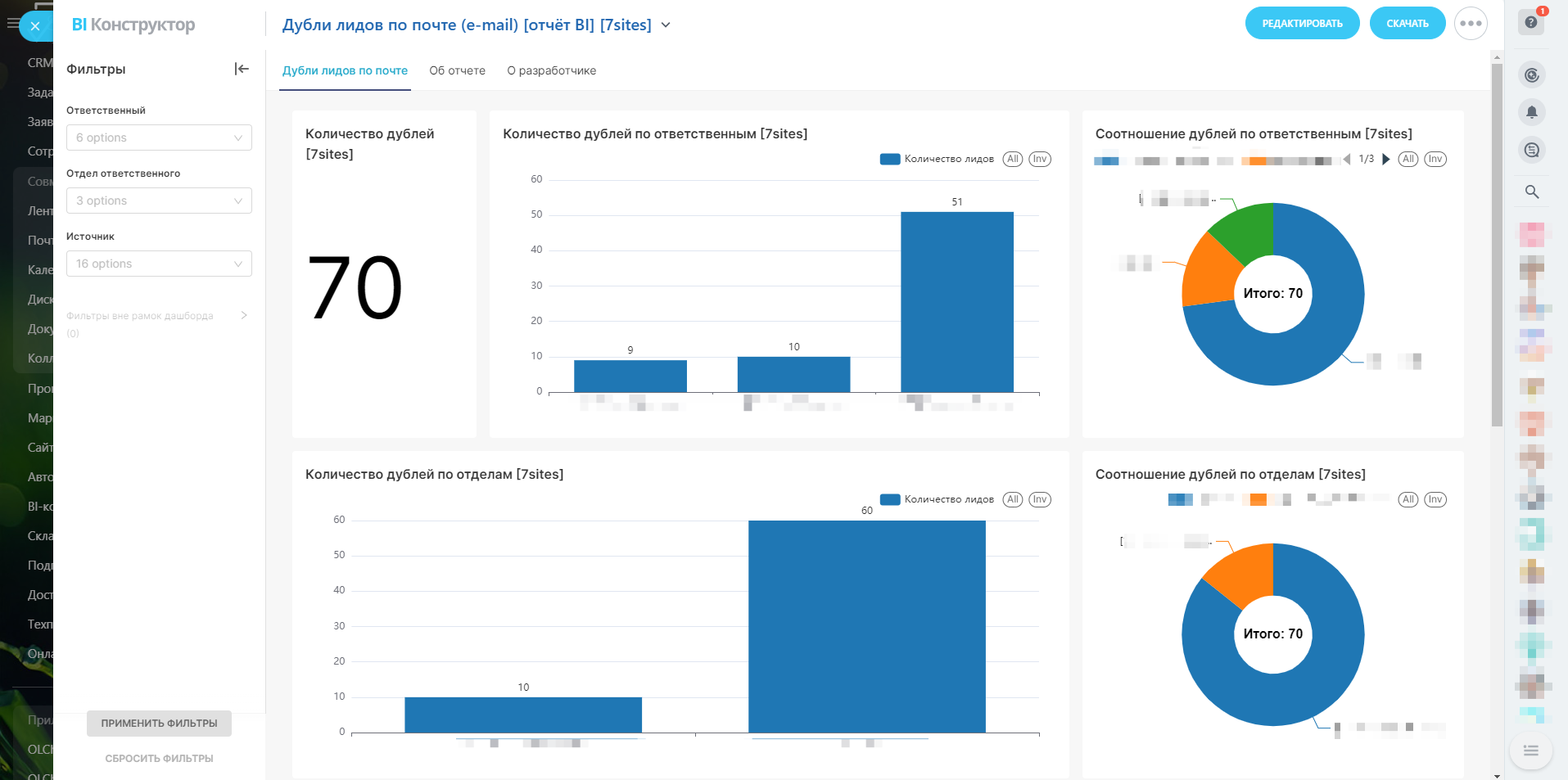 В отличие от стандартных средств поиска дублей, в отчёте можно сравнивать количество дублей как по ответственному в визуально удобном виде, так и в виде классической таблицы. Это даёт возможность сузить поиск причин образования дублей.