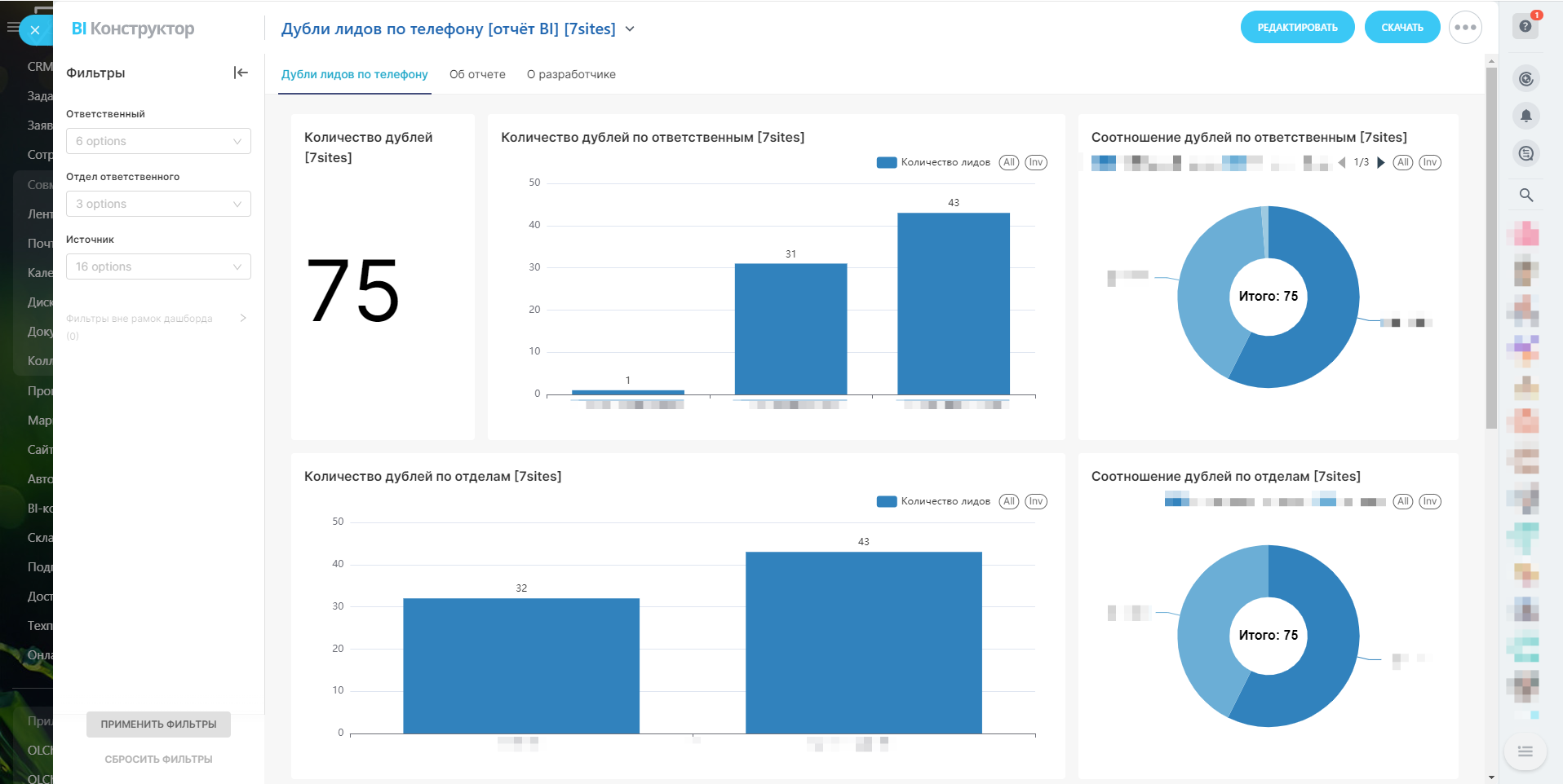 В отличие от стандартных средств поиска дублей, в отчёте можно сравнивать количество дублей как по ответственному в визуально удобном виде, так и в виде классической таблицы. Это даёт возможность сузить поиск причин образования дублей.
