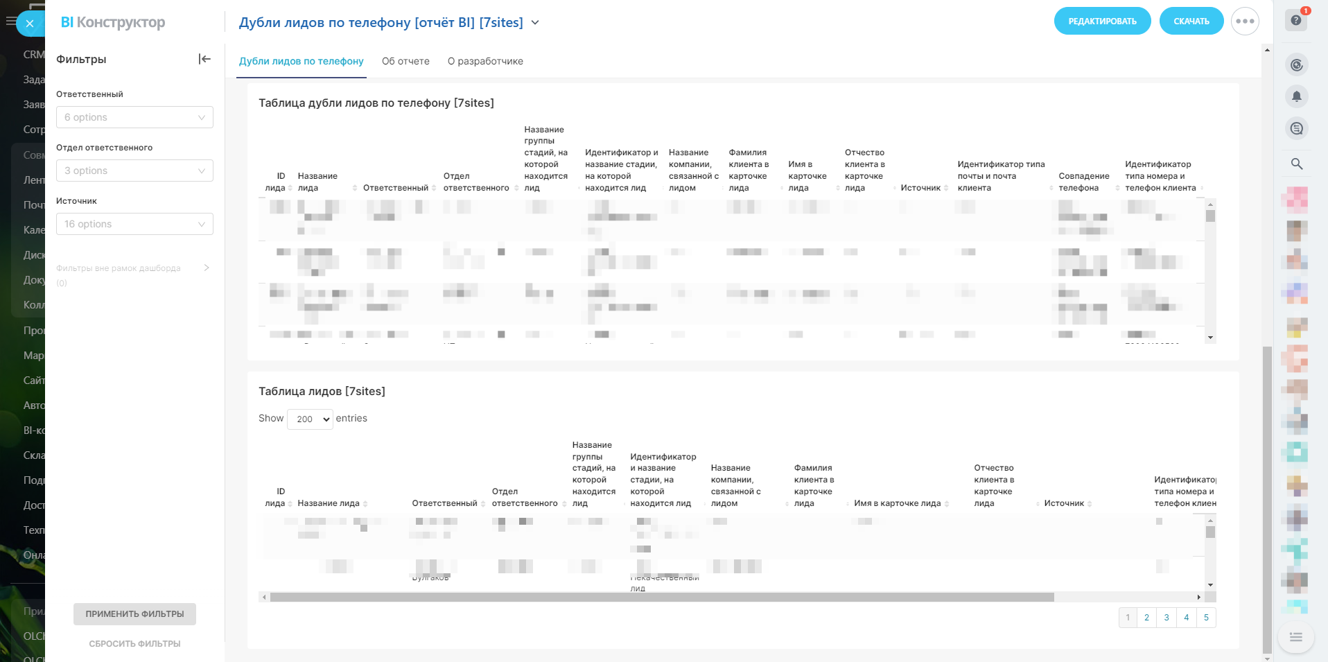 Также стоить обратить внимание: при выгрузке данных в BI-таблицы, такие поля, как почта и телефон имеют множественное значение. Это значит, что если указано несколько телефонов или несколько E-mail, то в выгрузке они будут перечислены через запятую. Отчёт при этом выведет наличие дублей только при полном совпадении записей.