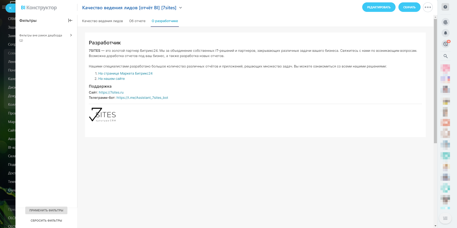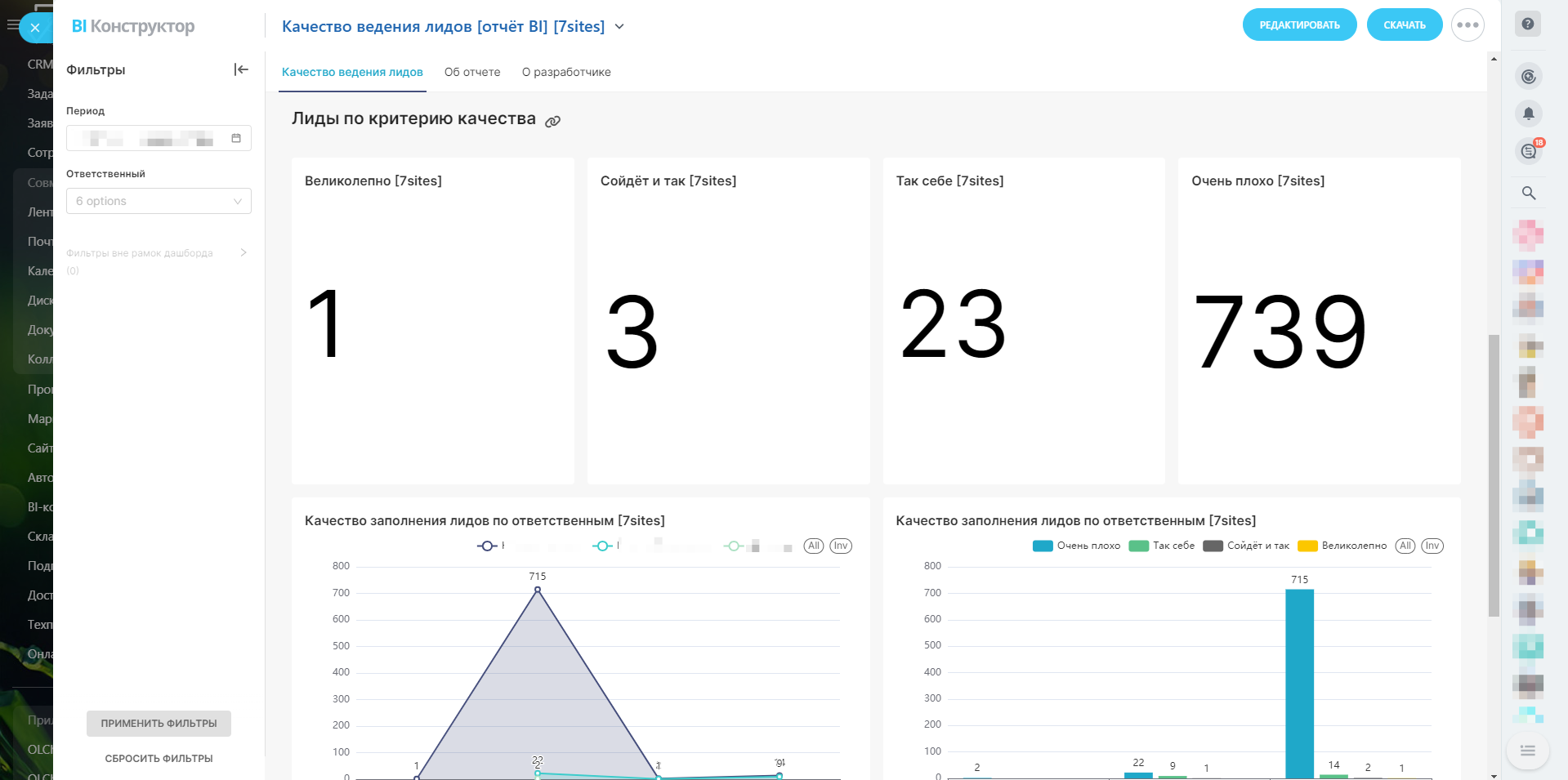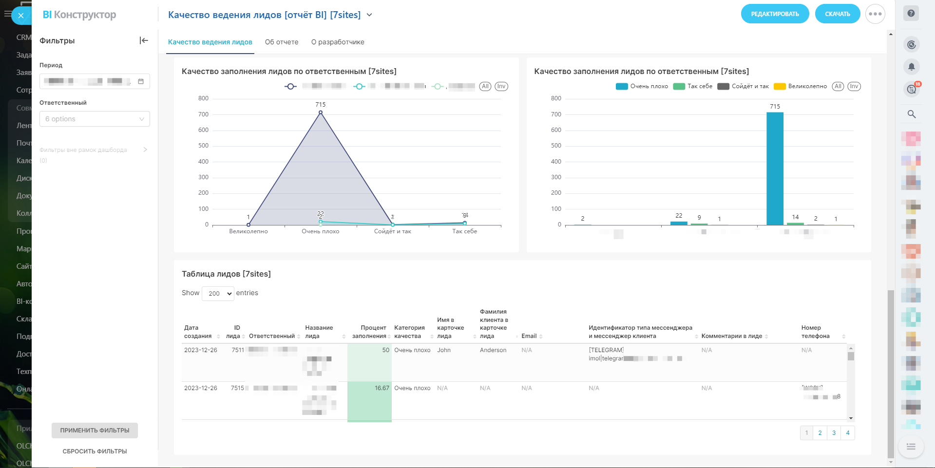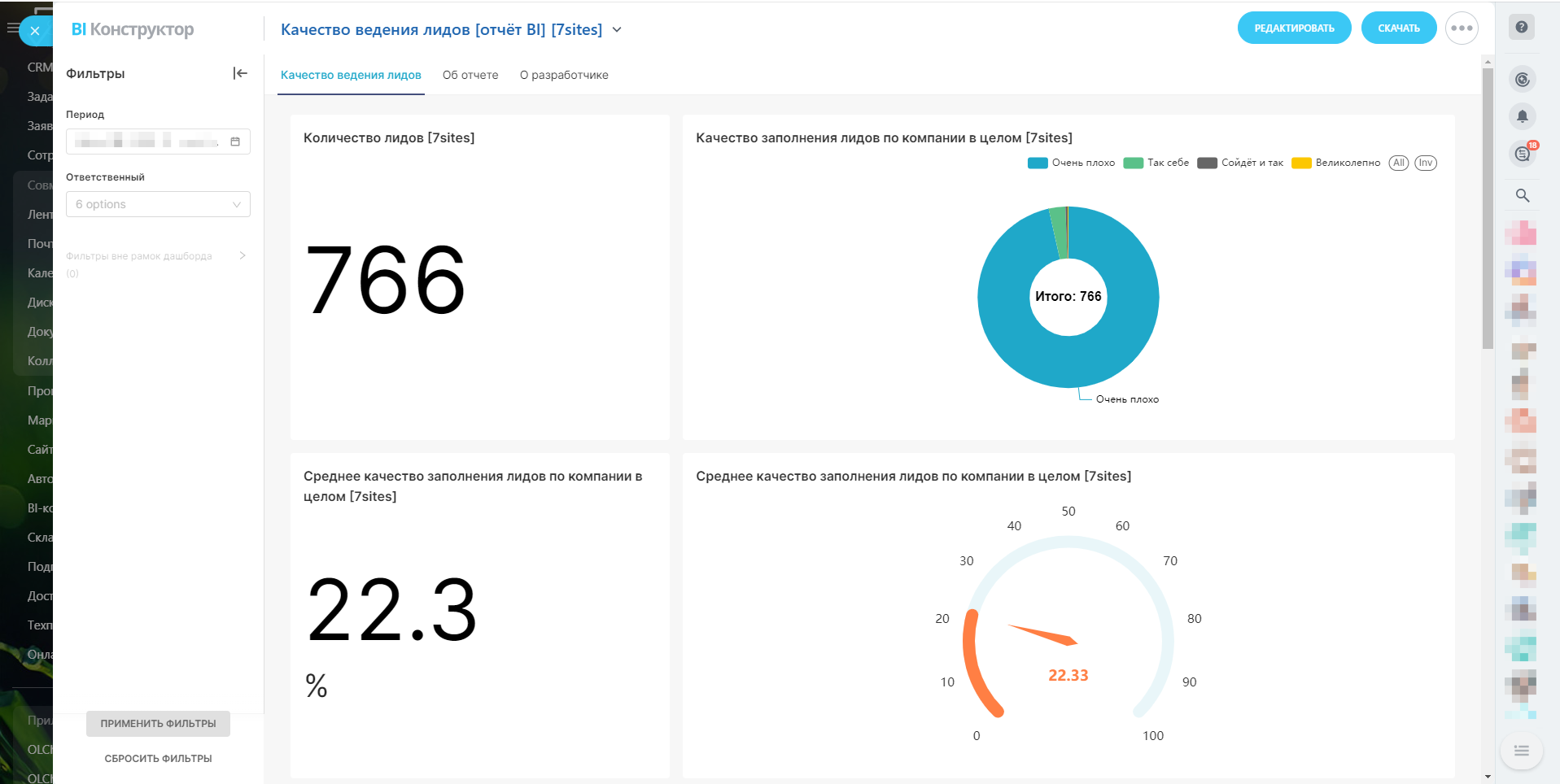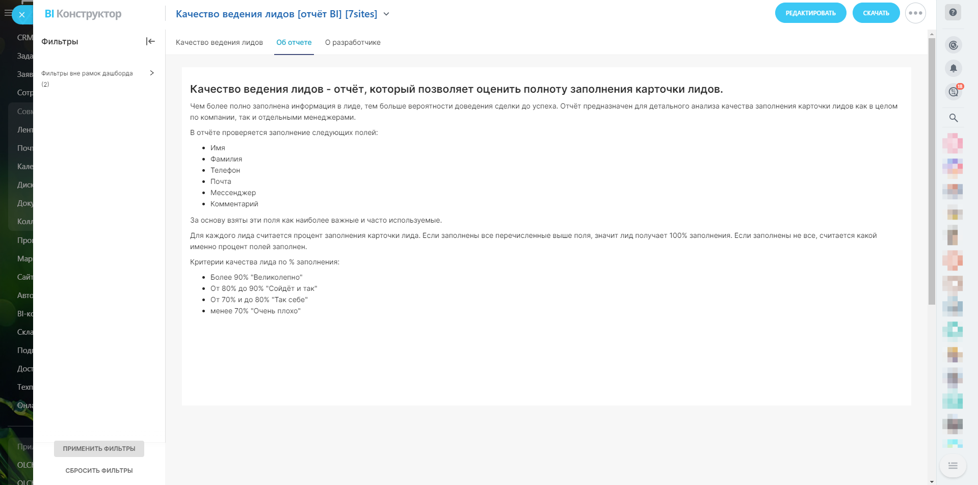Чем более полно заполнена информация в лиде, тем больше вероятности доведения сделки до успеха. Отчёт предназначен для детального анализа качества заполнения карточки лидов как в целом по компании, так и отдельными менеджерами.