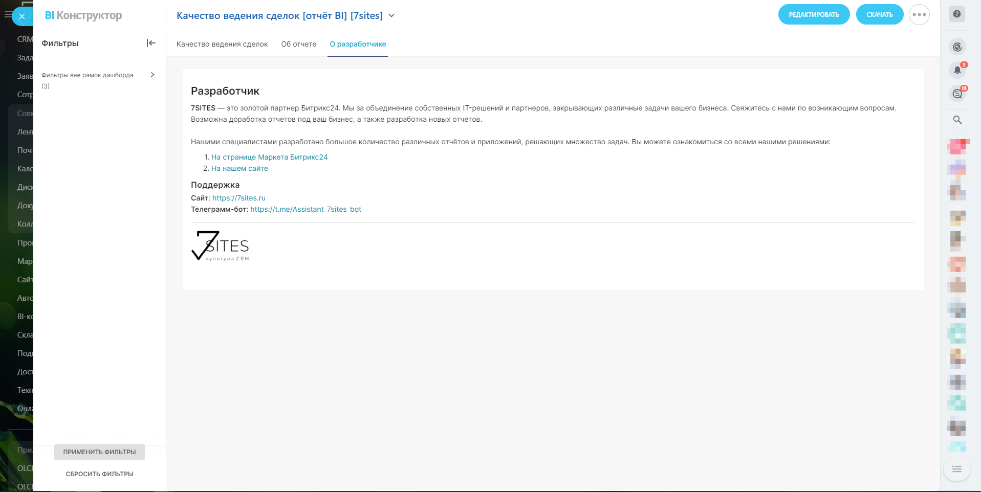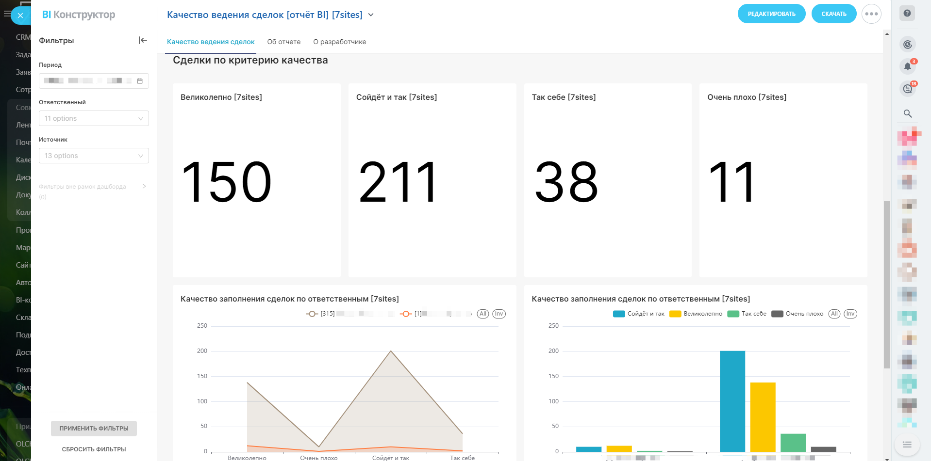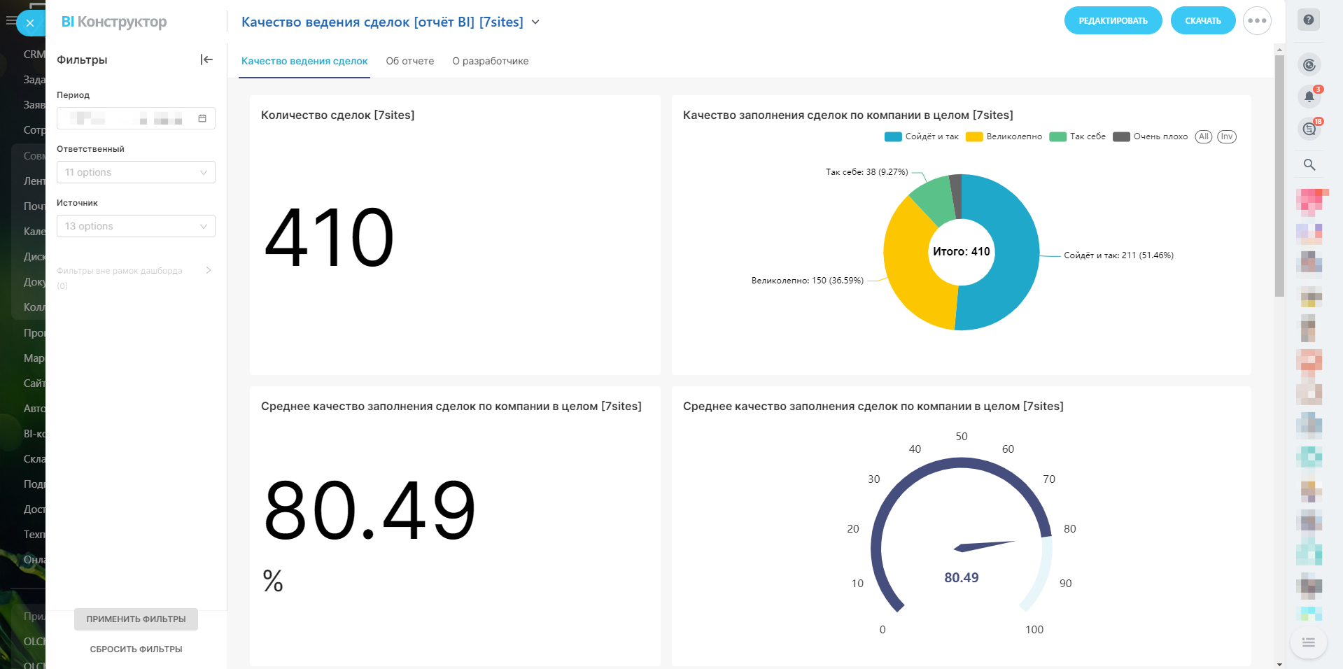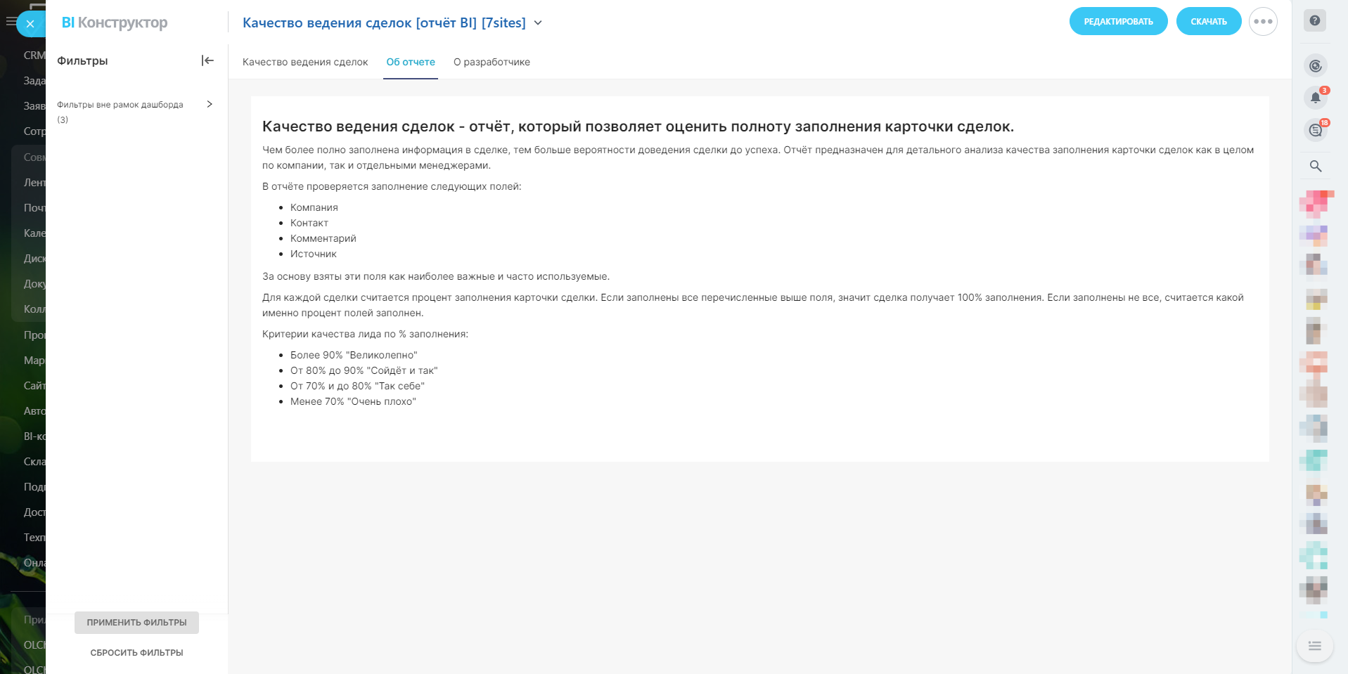 Качество ведения сделок - отчёт, который позволяет оценить полноту заполнения карточки сделок.
