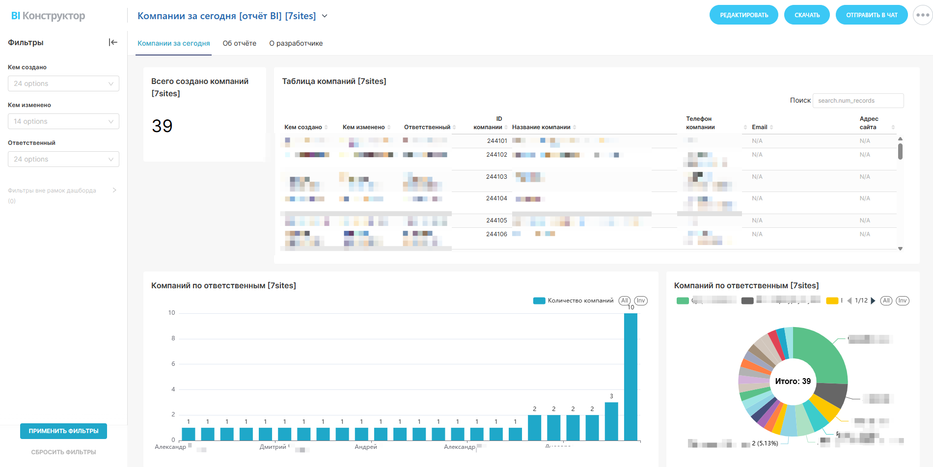 Распределение нагрузки и потенциальных клиентов: Наглядные диаграммы показывают, за кем из менеджеров закреплено больше всего новых компаний.