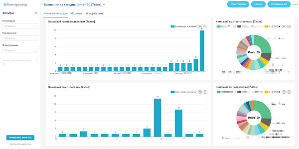 Распределение нагрузки и потенциальных клиентов: Наглядные диаграммы показывают, за кем из менеджеров закреплено больше всего новых компаний.