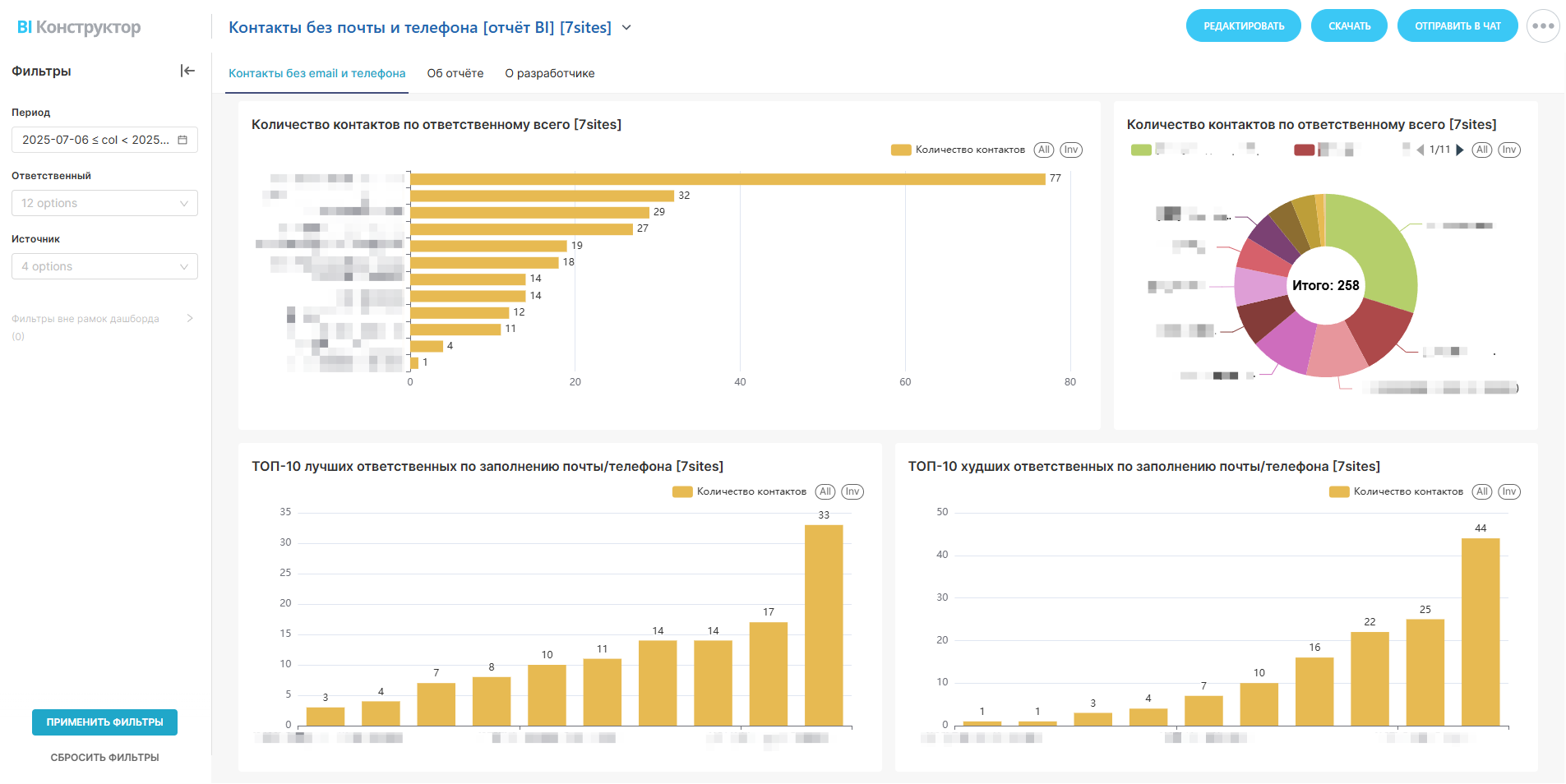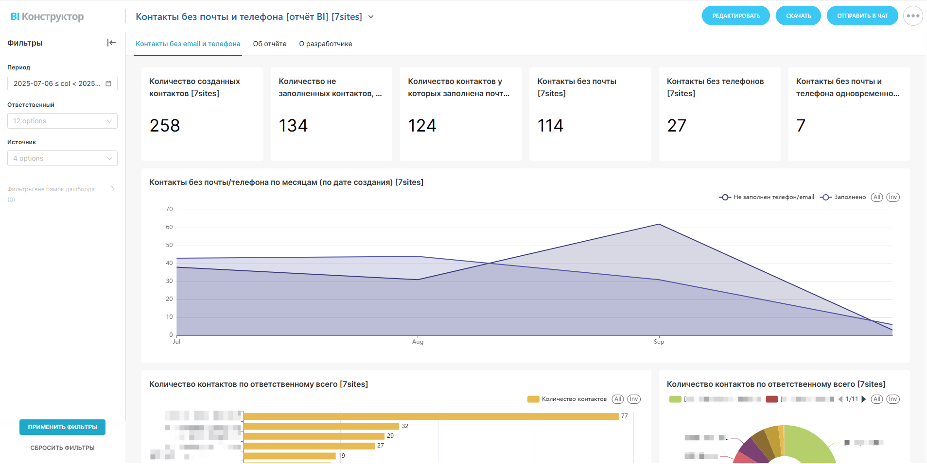 7. Контакты без почты/телефонов по месяцам. Отчёт включает временной анализ количества контактов без почты и телефона, разделённых по месяцам. Это помогает выявить тенденции и периоды, когда наблюдаются наиболее высокие уровни недостатка информации.