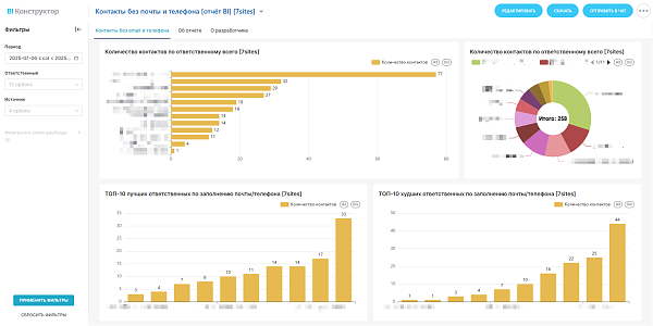 10. ТОП-10 худших менеджеров по заполнению почты/телефонов. Здесь представлены менеджеры, которые имеют наименьшие показатели по заполнению информации. Это может служить основой для дальнейшего обучения и улучшения качества работы.