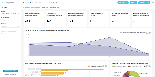 2. Количество не заполненных контактов. Здесь представлено количество контактов, в которых отсутствует либо почта, либо телефон. Это говорит о том, что данные не являются полными и могут затруднять дальнейшую работу с этими контактами.