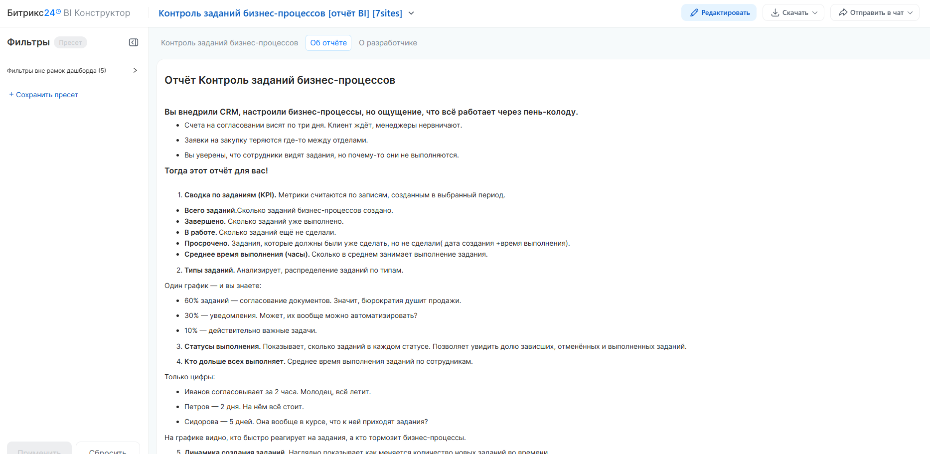 Этот отчёт — диспетчерская бизнес-процессов. Он показывает: