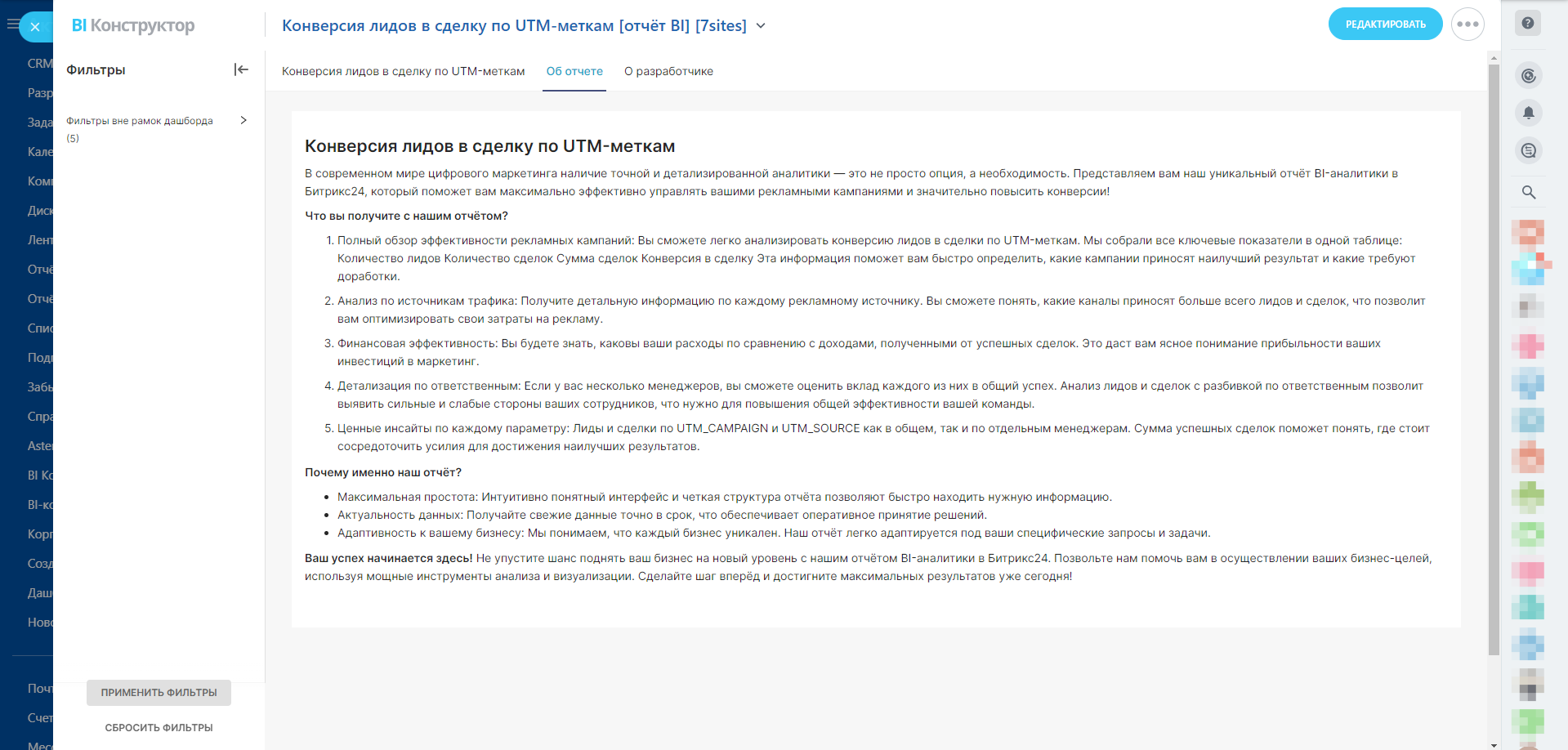 В современном мире цифрового маркетинга наличие точной и детализированной аналитики — это не просто опция, а необходимость. Представляем вам наш уникальный отчёт BI-аналитики в Битрикс24, который поможет вам максимально эффективно управлять вашими рекламными кампаниями и значительно повысить конверсии!