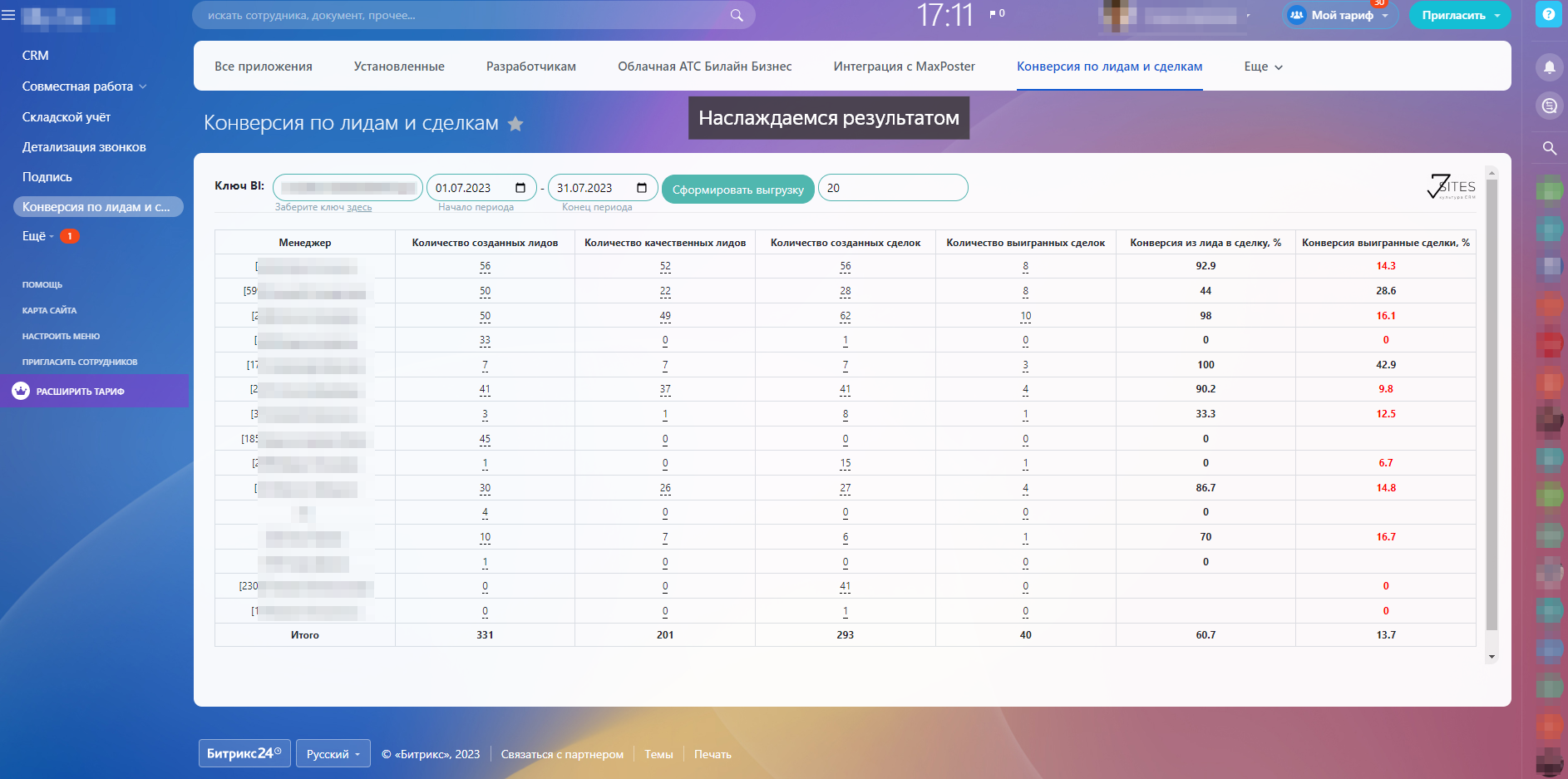 Отличие 3. Можно задать эталон конверсии в %, учитывая вашу специфику. Так, если конверсия менеджера в продажи будет ниже заданного эталонного значения, то система подсветит показатель - красным цветом.