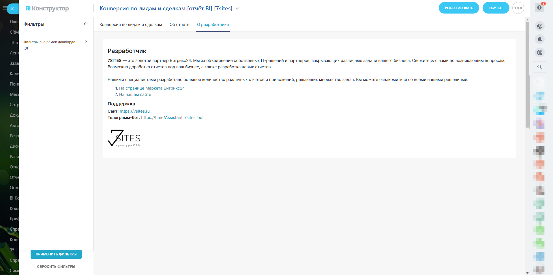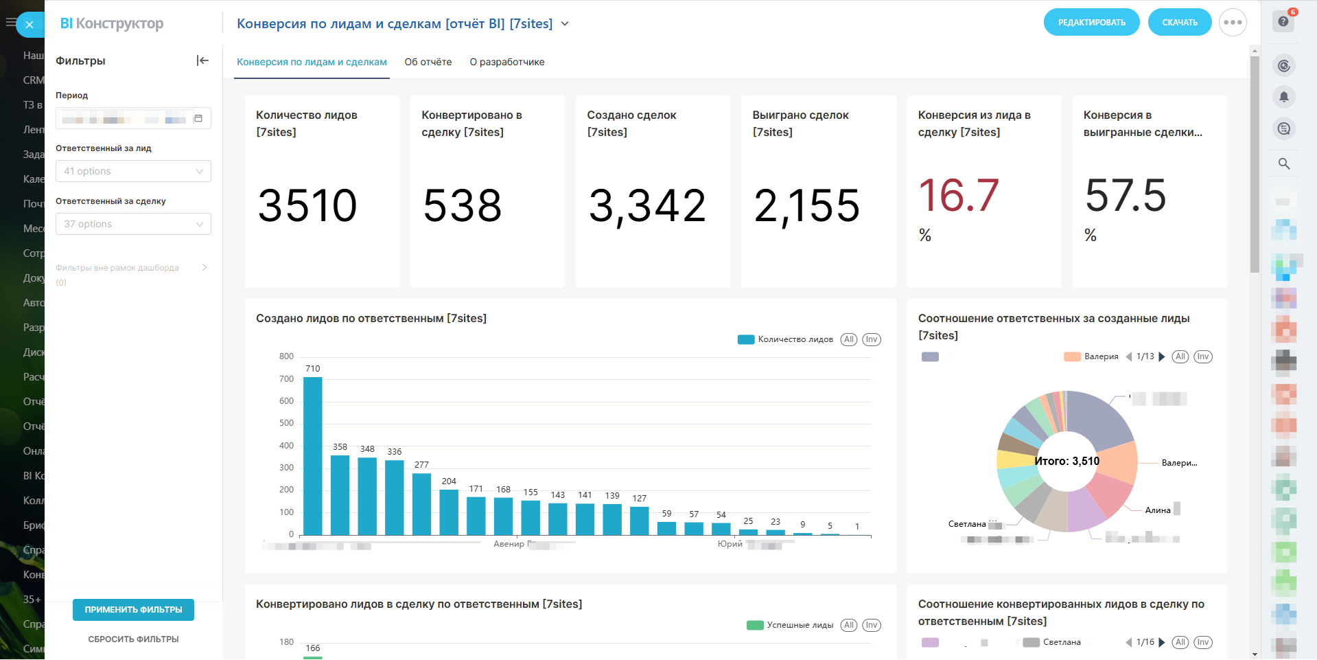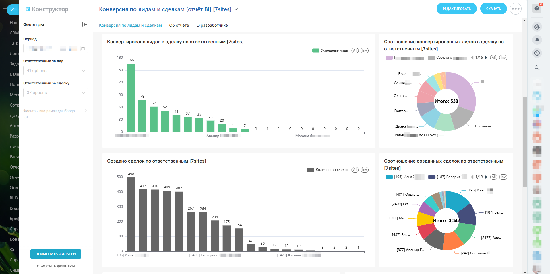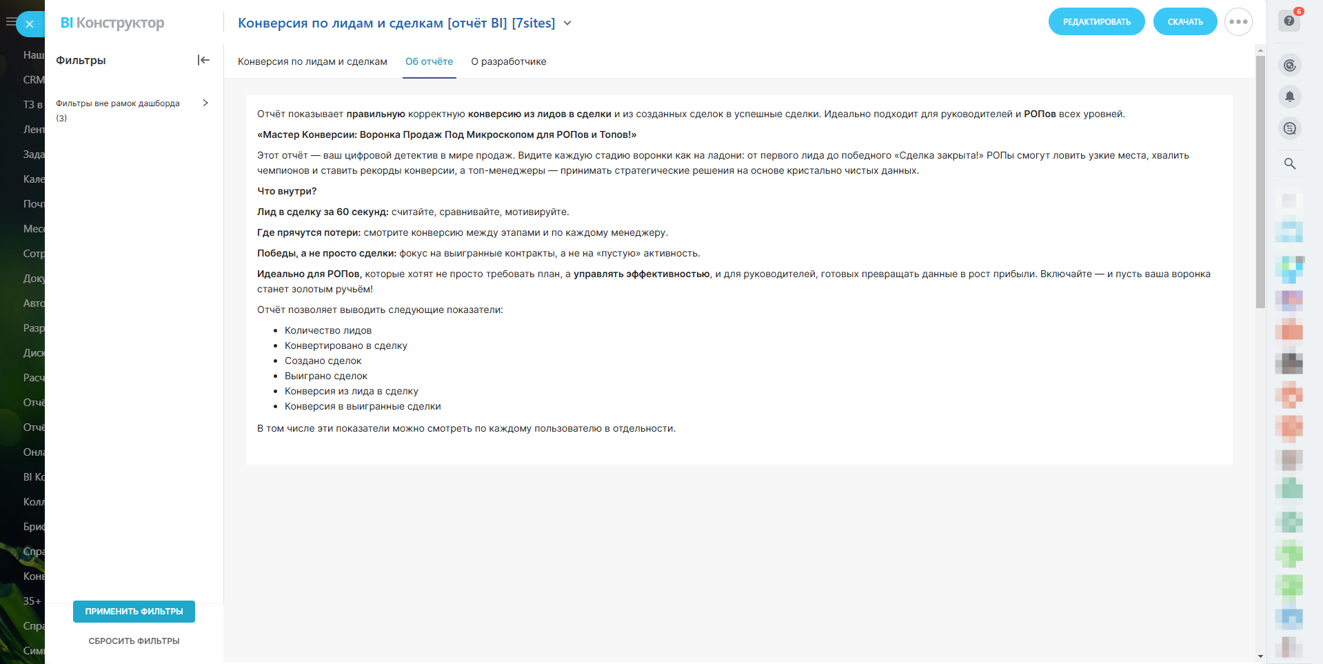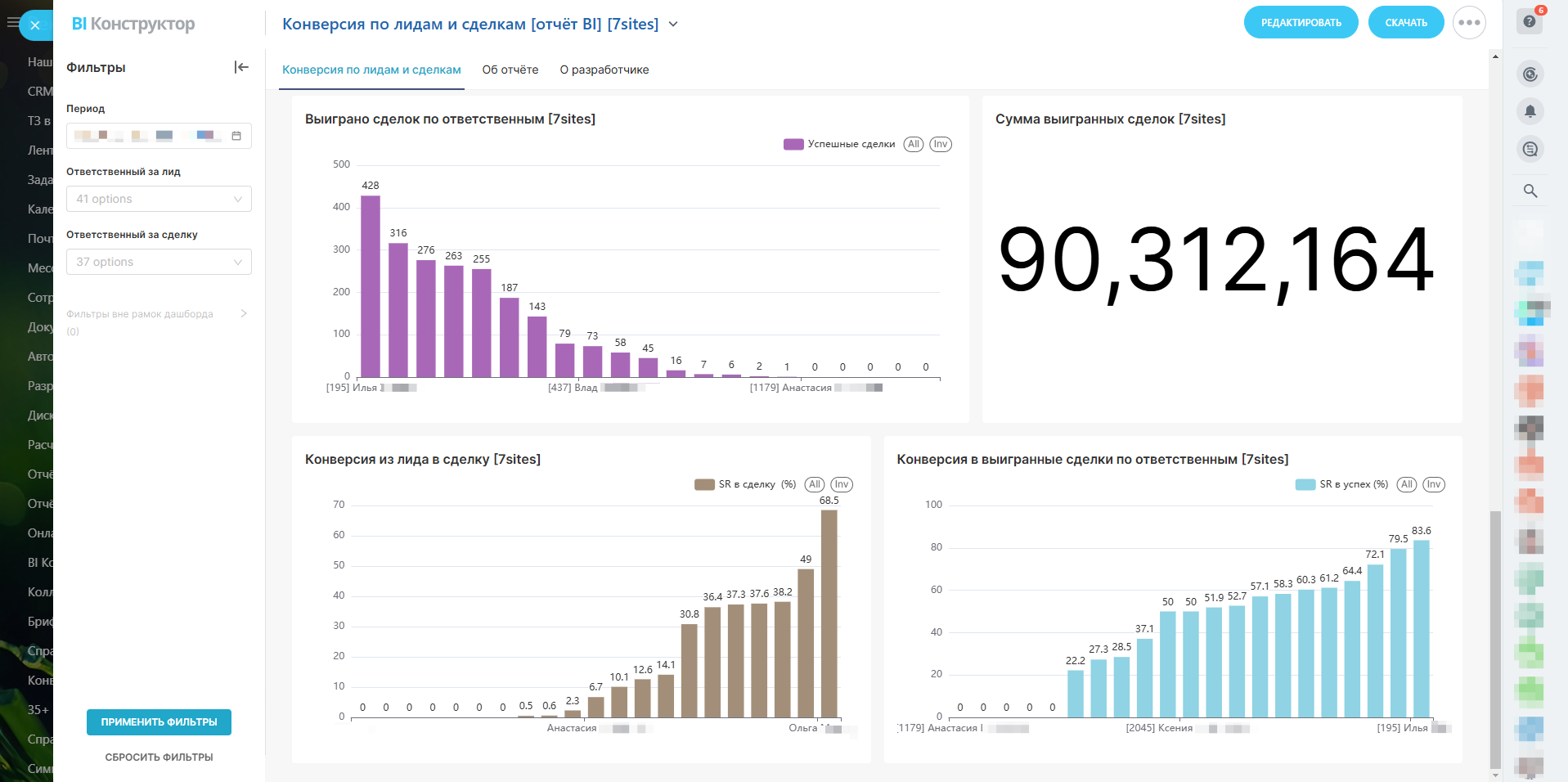 Отчёт показывает правильную корректную конверсию из лидов в сделки и из созданных сделок в успешные сделки. Идеально подходит для руководителей и РОПов всех уровней.