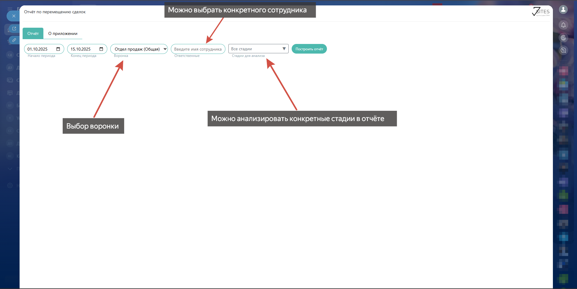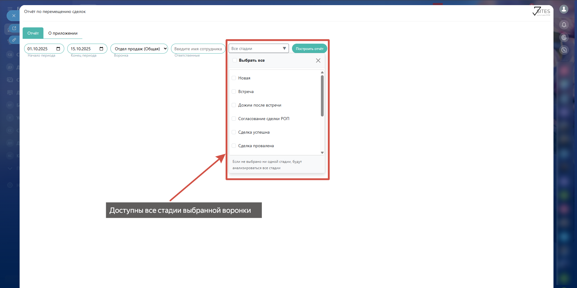 - Период: определяет временной интервал для анализа истории стадий.