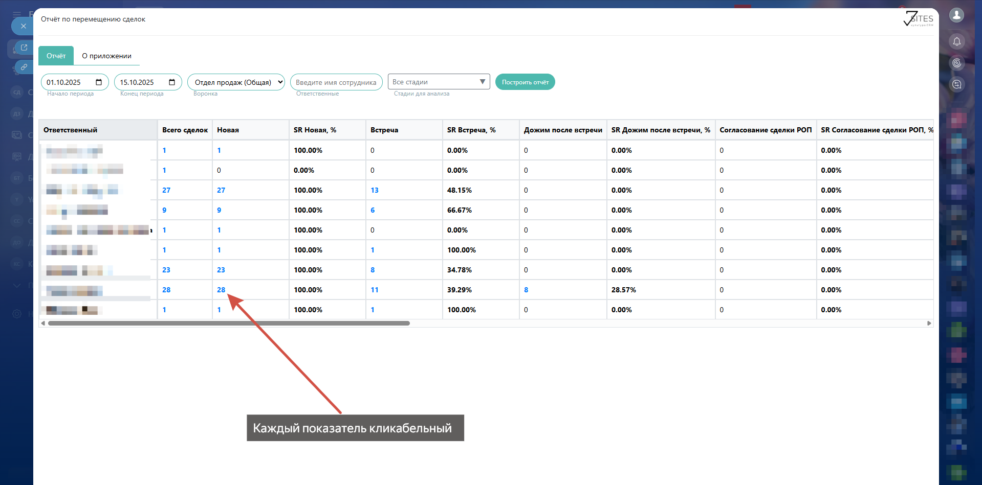 - Показывает SR (Strike Rate) для каждой стадии - процент сделок, которые прошли через данную стадию.
