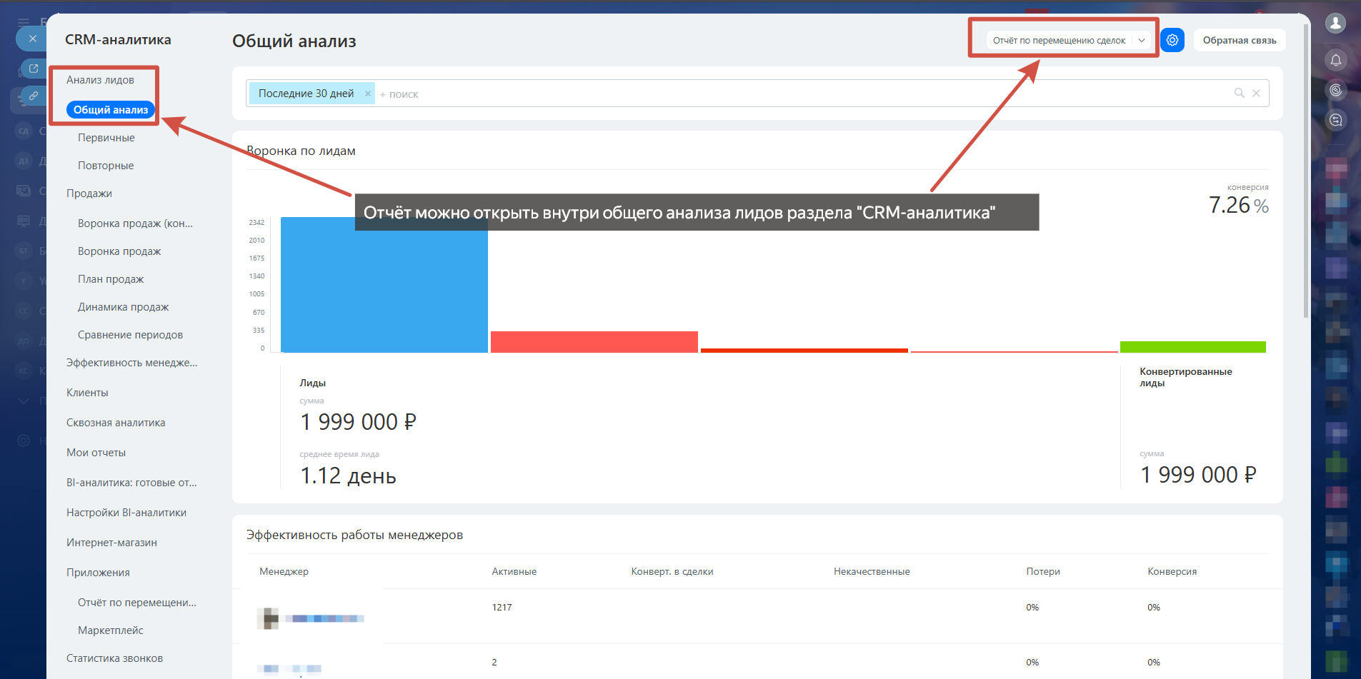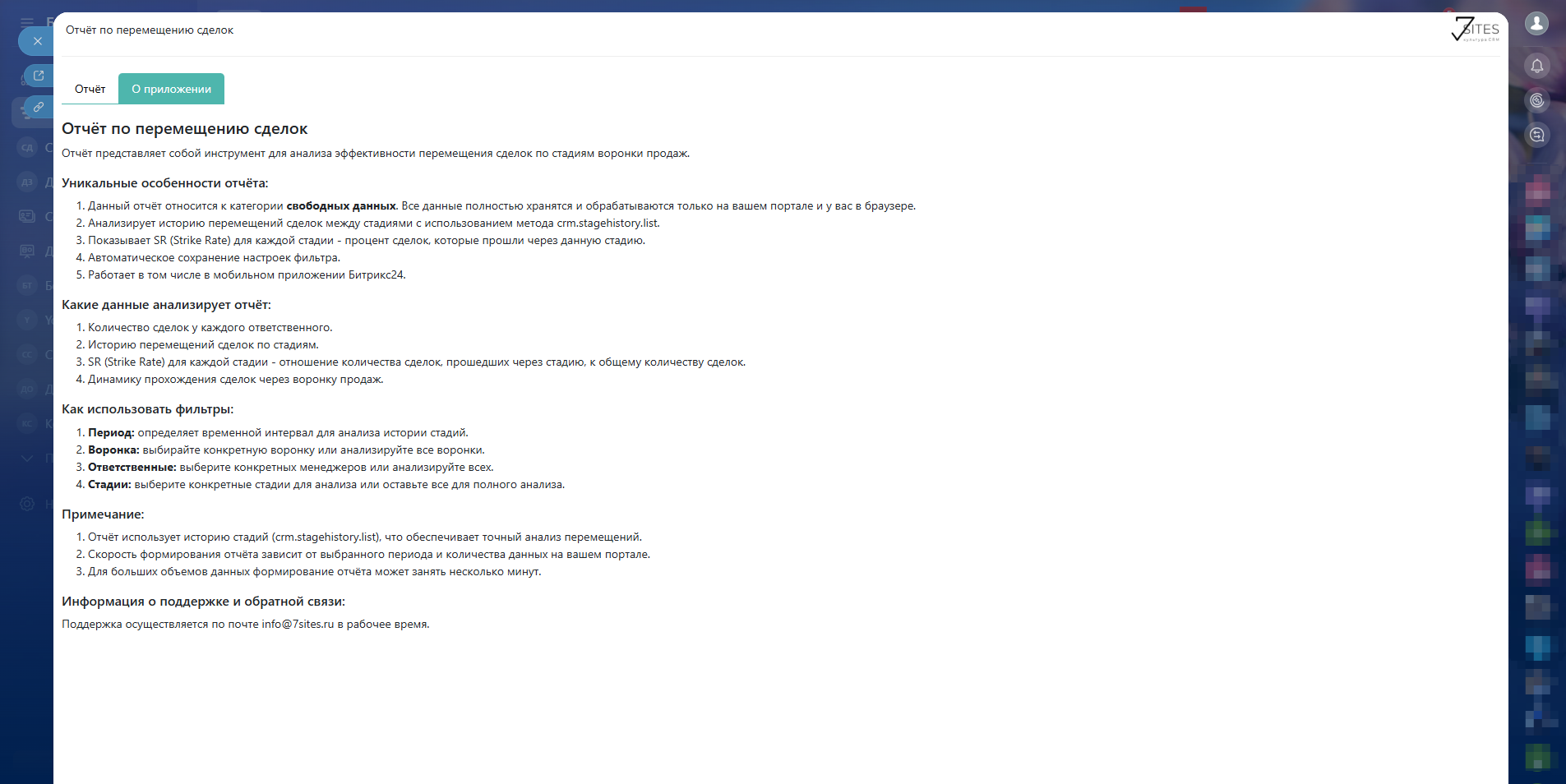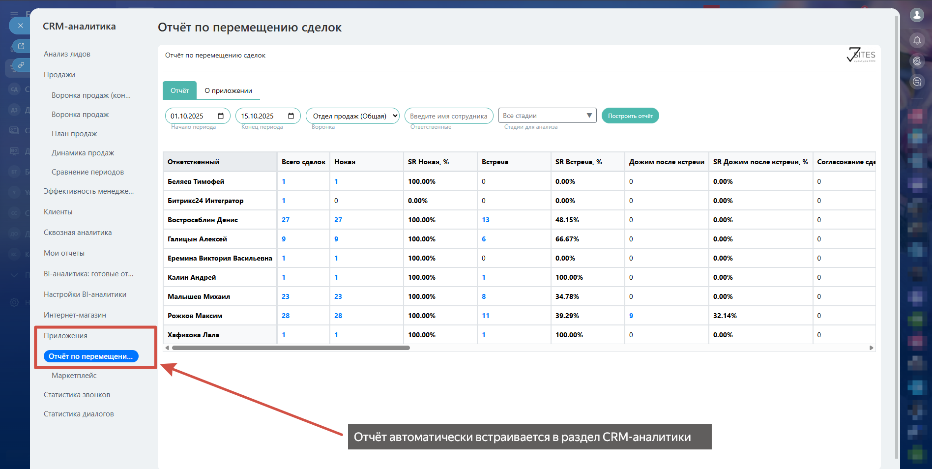 Отчёт представляет собой инструмент для анализа эффективности перемещения сделок по стадиям воронки продаж.