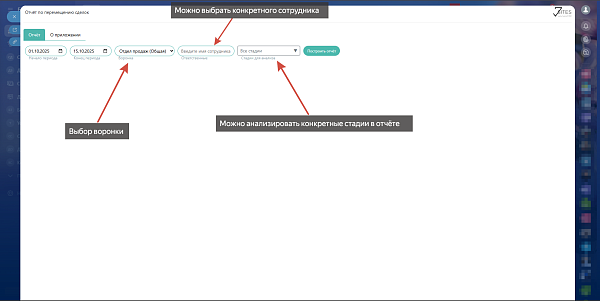 - Период: определяет временной интервал для анализа истории стадий.