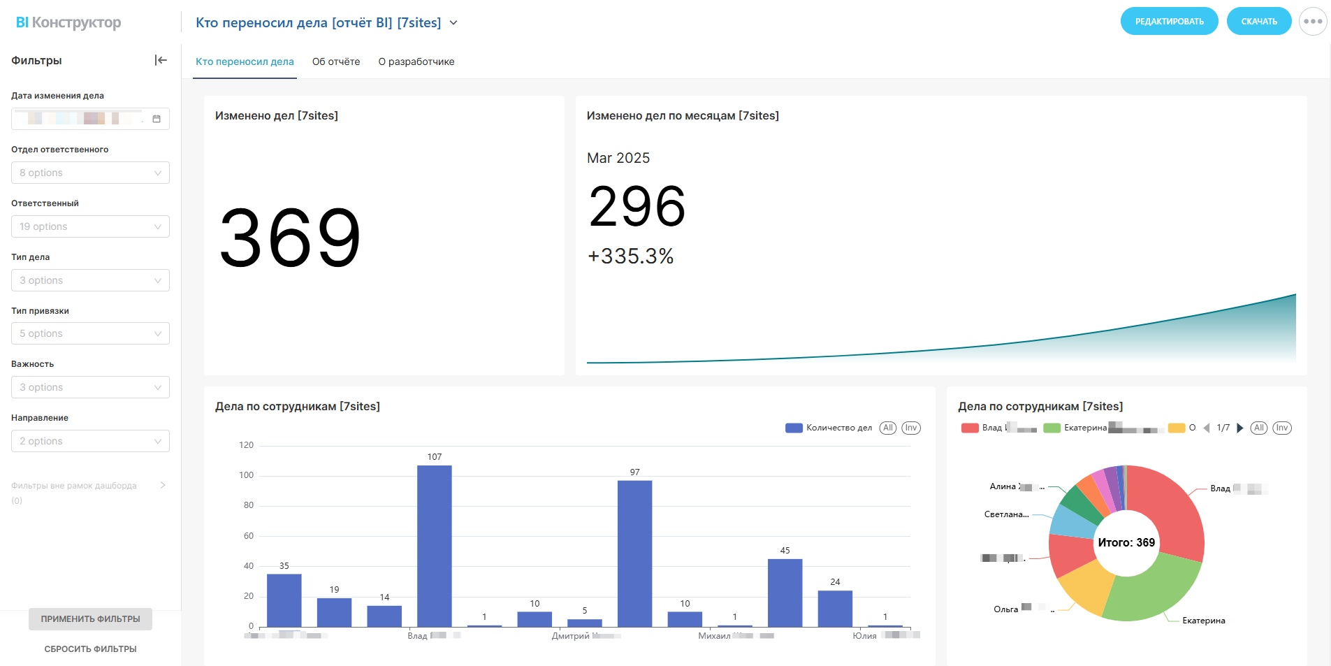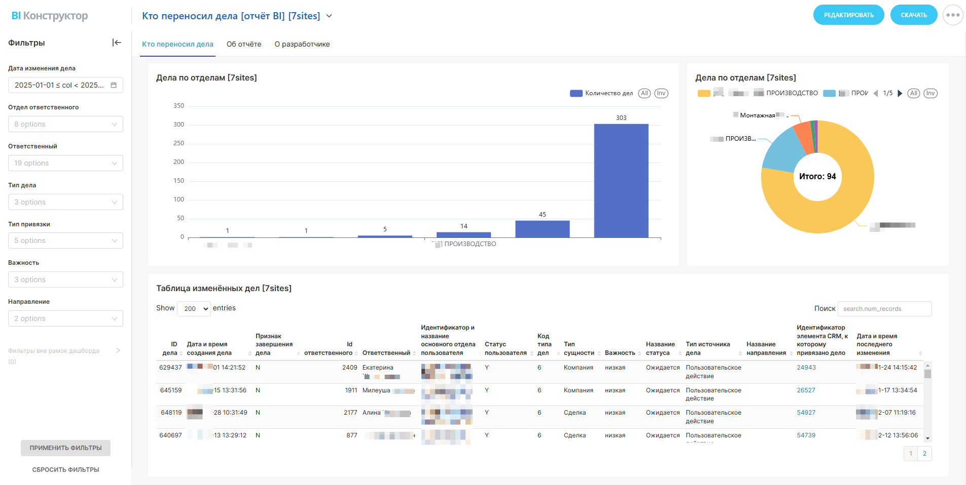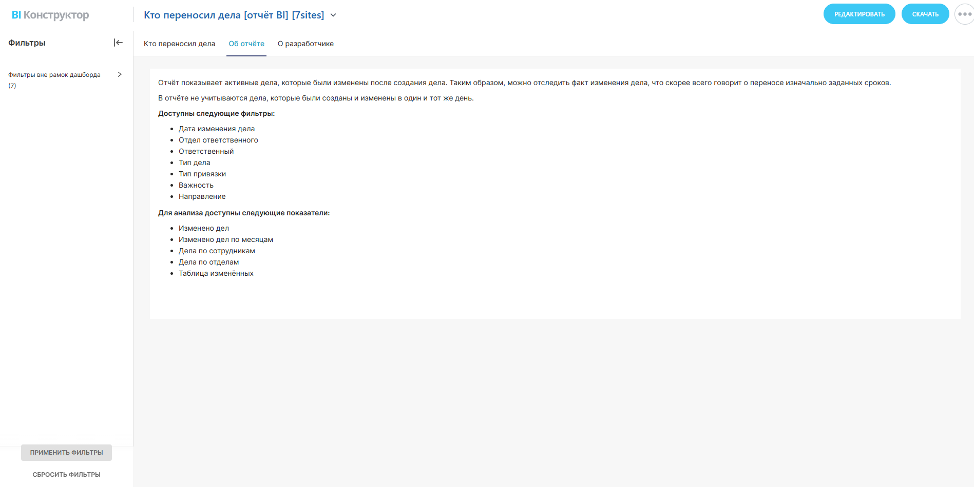 Отчёт показывает активные дела, которые были изменены после создания дела. Таким образом, можно отследить факт изменения дела, что скорее всего говорит о переносе изначально заданных сроков.