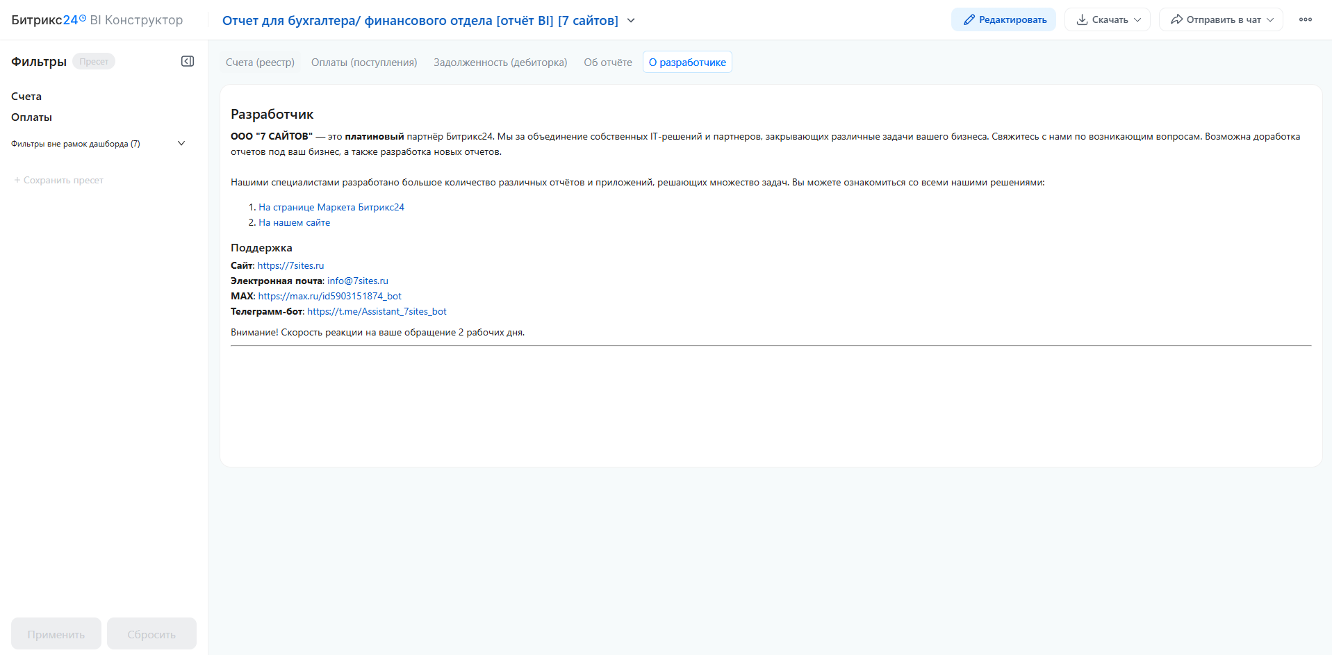 - Перестать собирать дебиторку вручную по всем счетам — отчёт показывает полный реестр с сортировкой по просрочке.