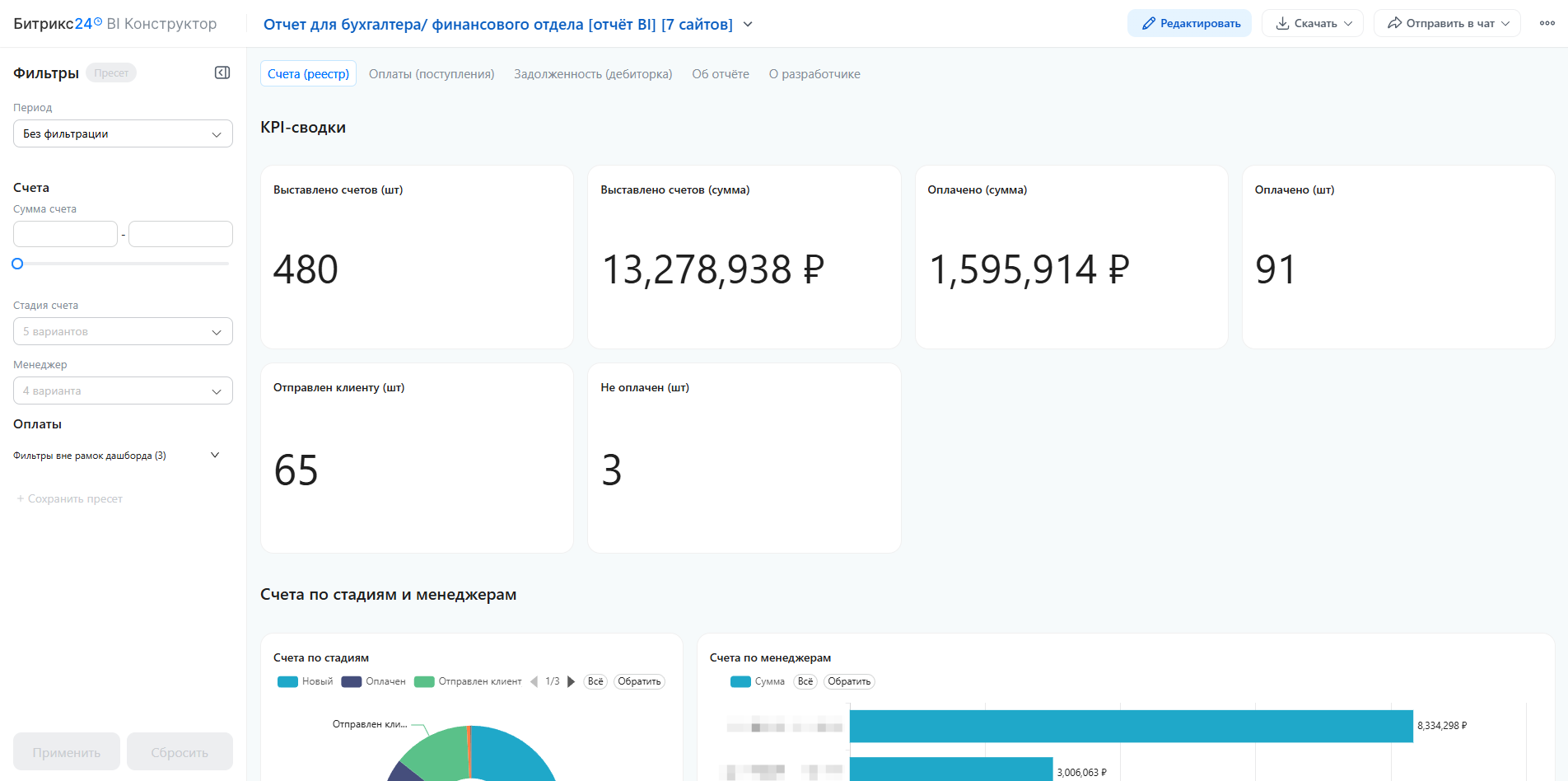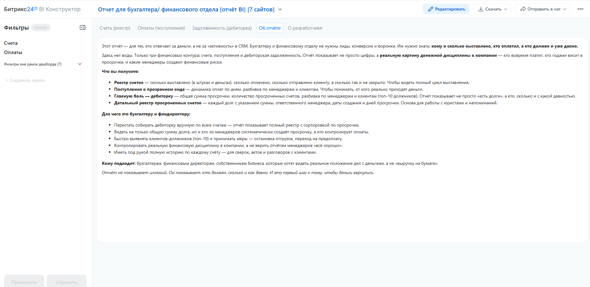 Этот отчёт — для тех, кто отвечает за деньги, а не за «активность» в CRM. Бухгалтеру и финансовому отделу не нужны лиды, конверсии и воронки. Им нужно знать: кому и сколько выставлено, кто оплатил, а кто должен и уже давно.