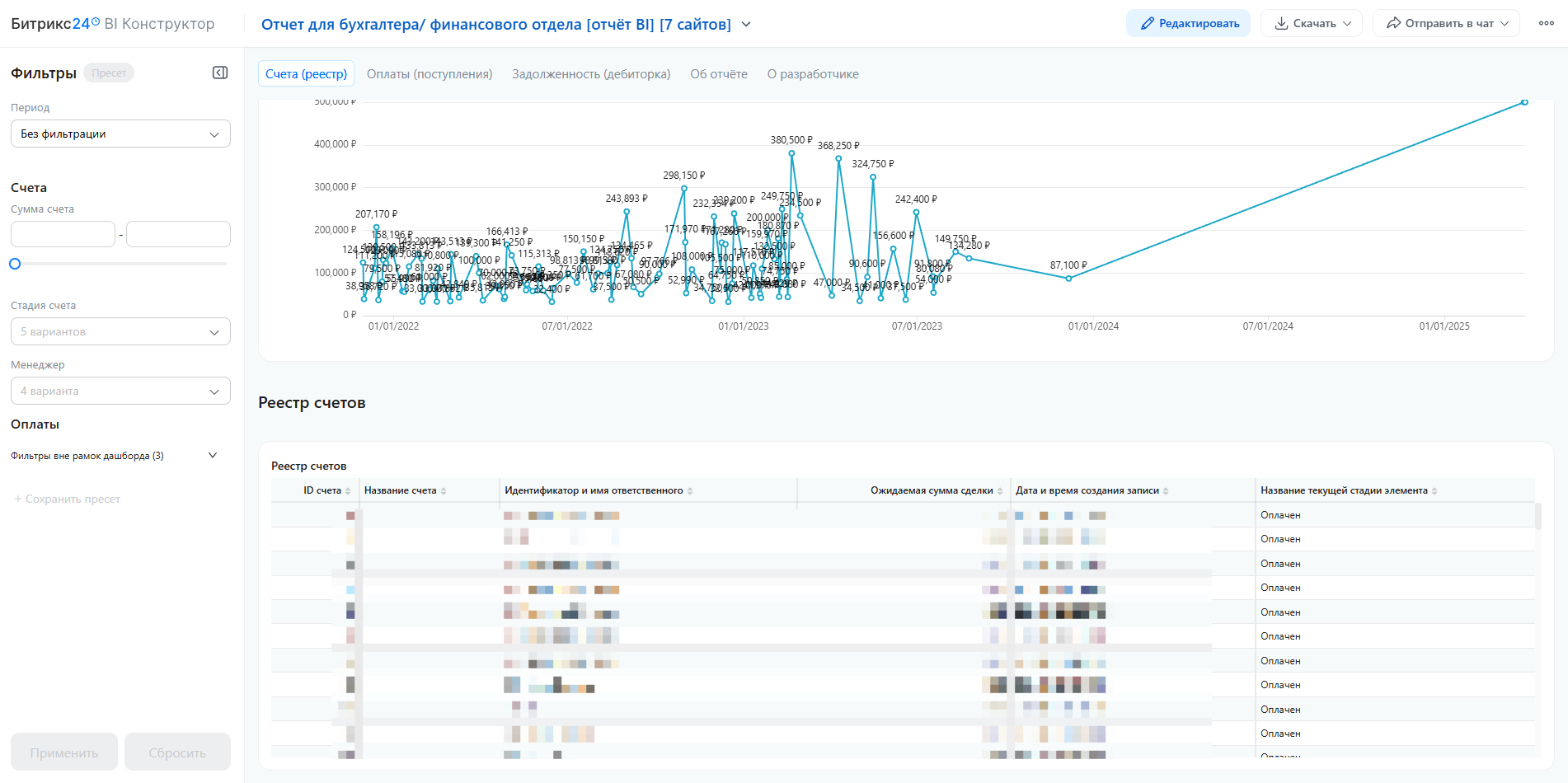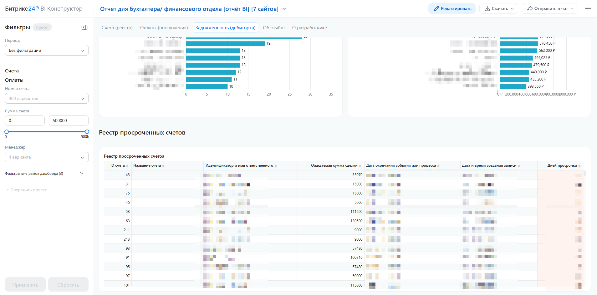 - Детальный реестр просроченных счетов — каждый долг с указанием суммы, ответственного менеджера, даты создания и дней просрочки. Основа для работы с юристами и напоминаний.