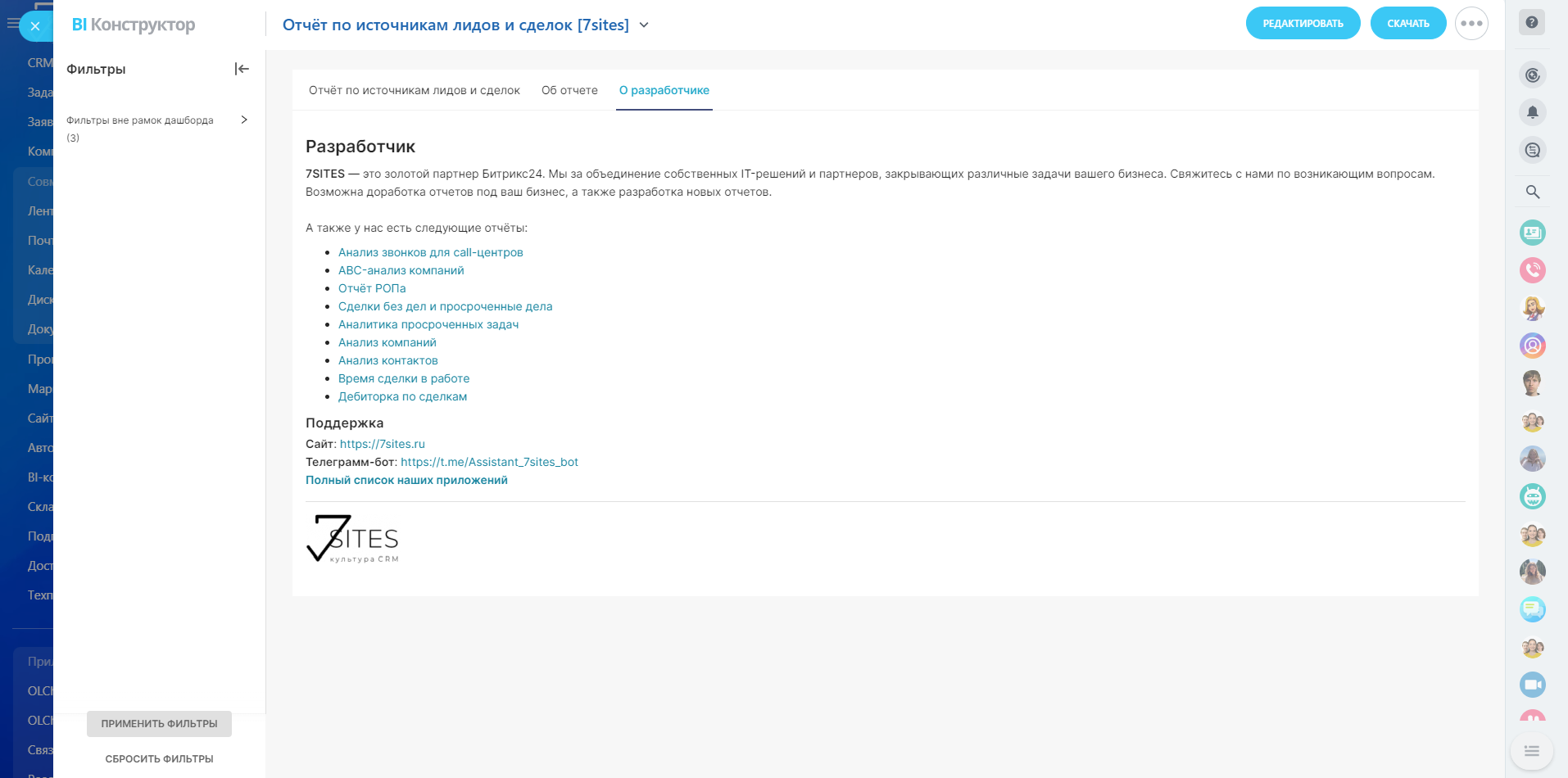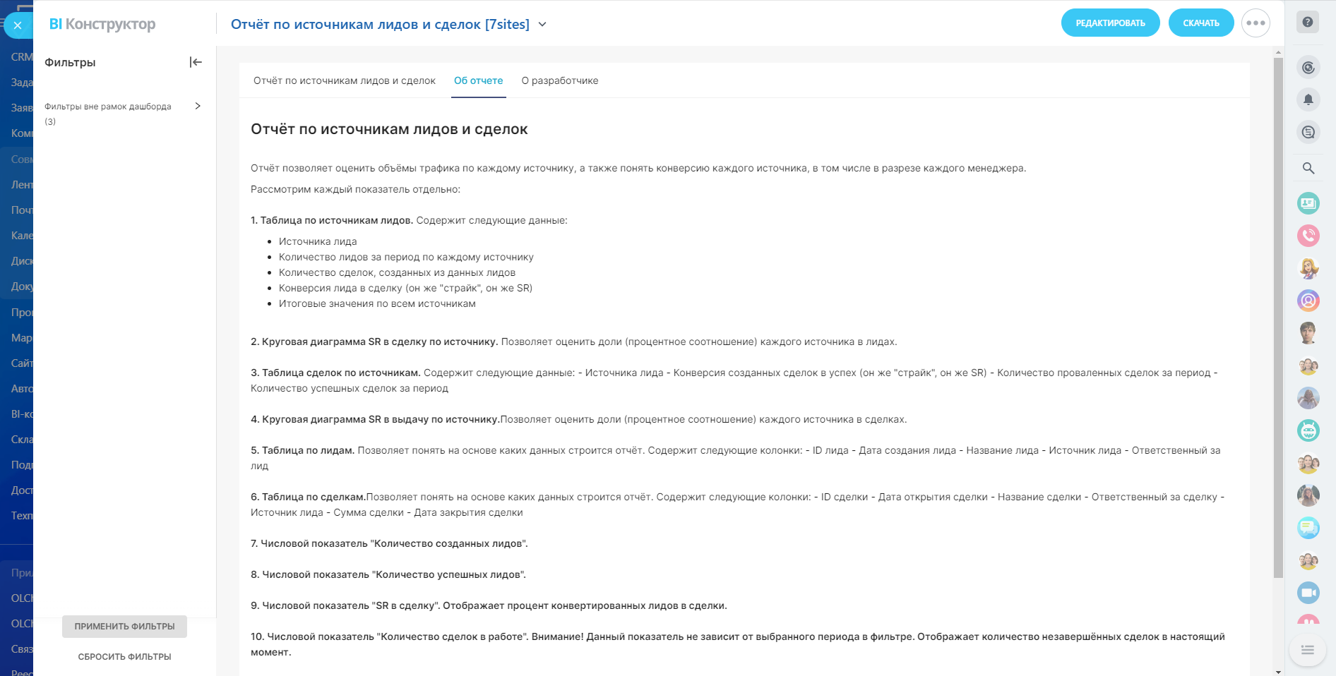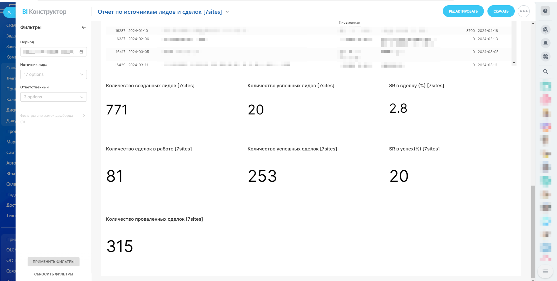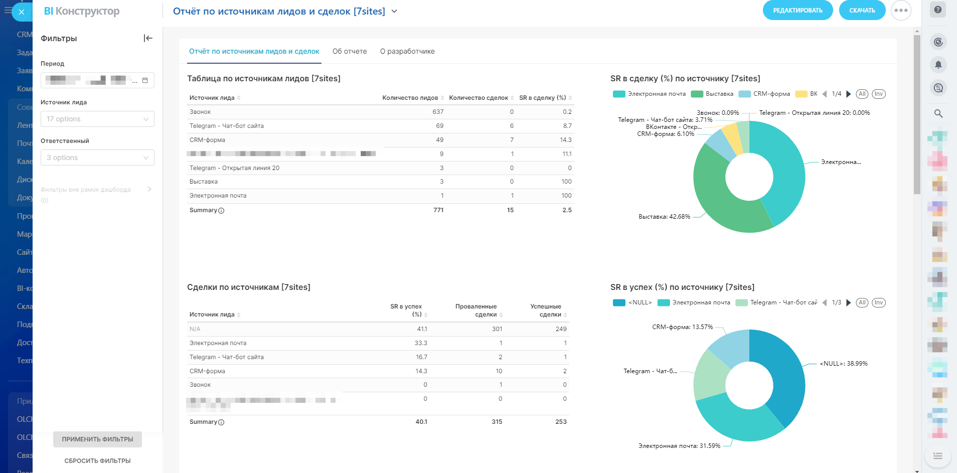 Отчёт позволяет оценить объёмы трафика по каждому источнику, а также понять конверсию каждого источника, в том числе в разрезе каждого менеджера.