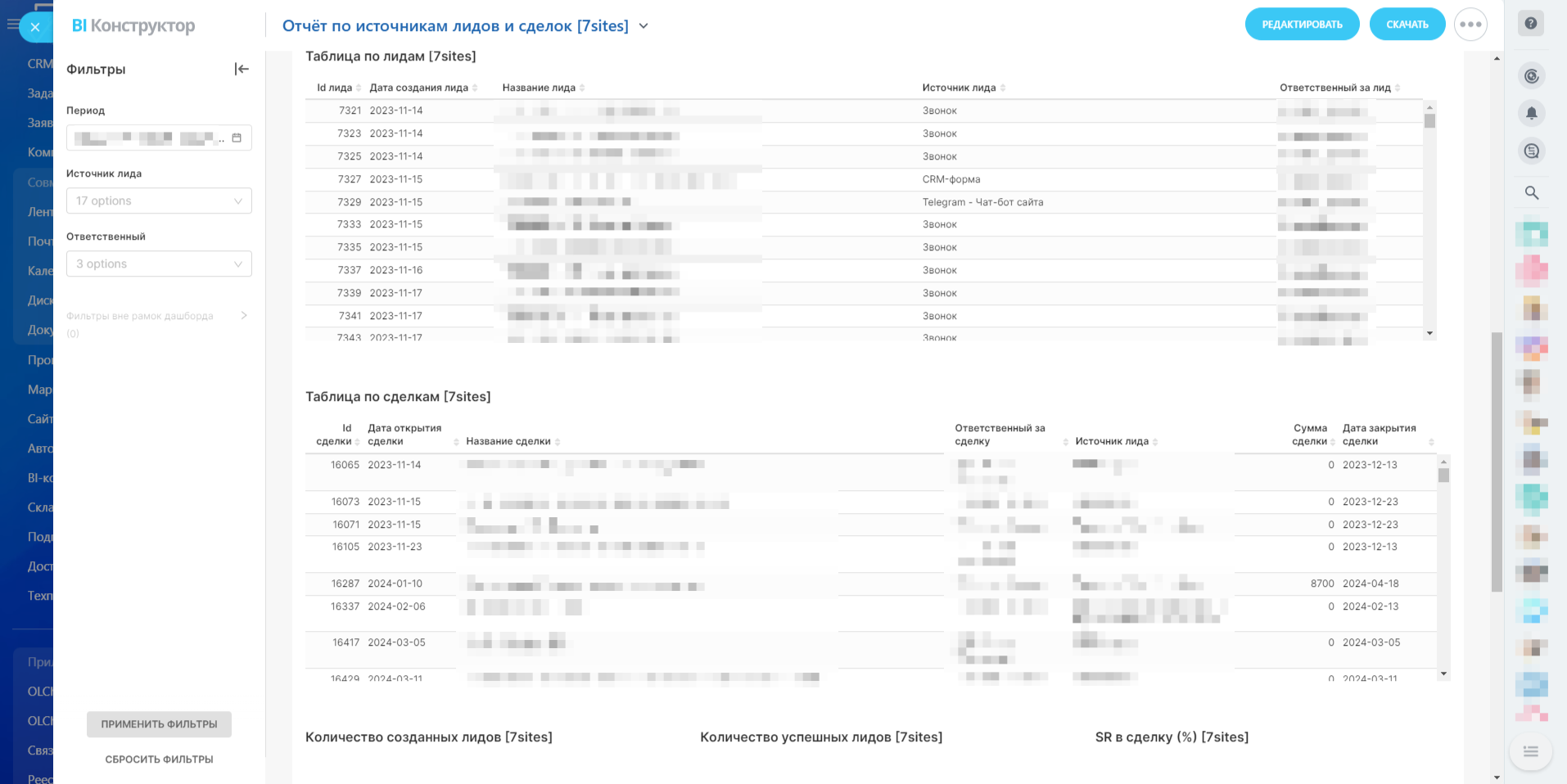 5. Таблица по лидам. Позволяет понять на основе каких данных строится отчёт. Содержит следующие колонки: