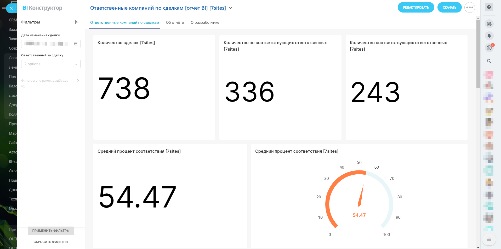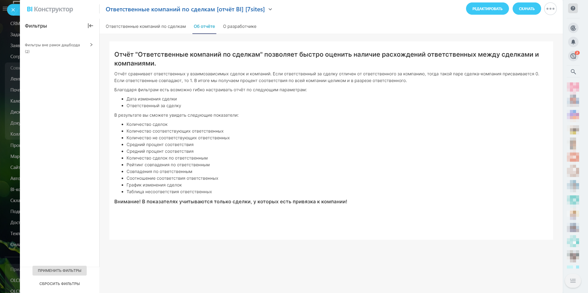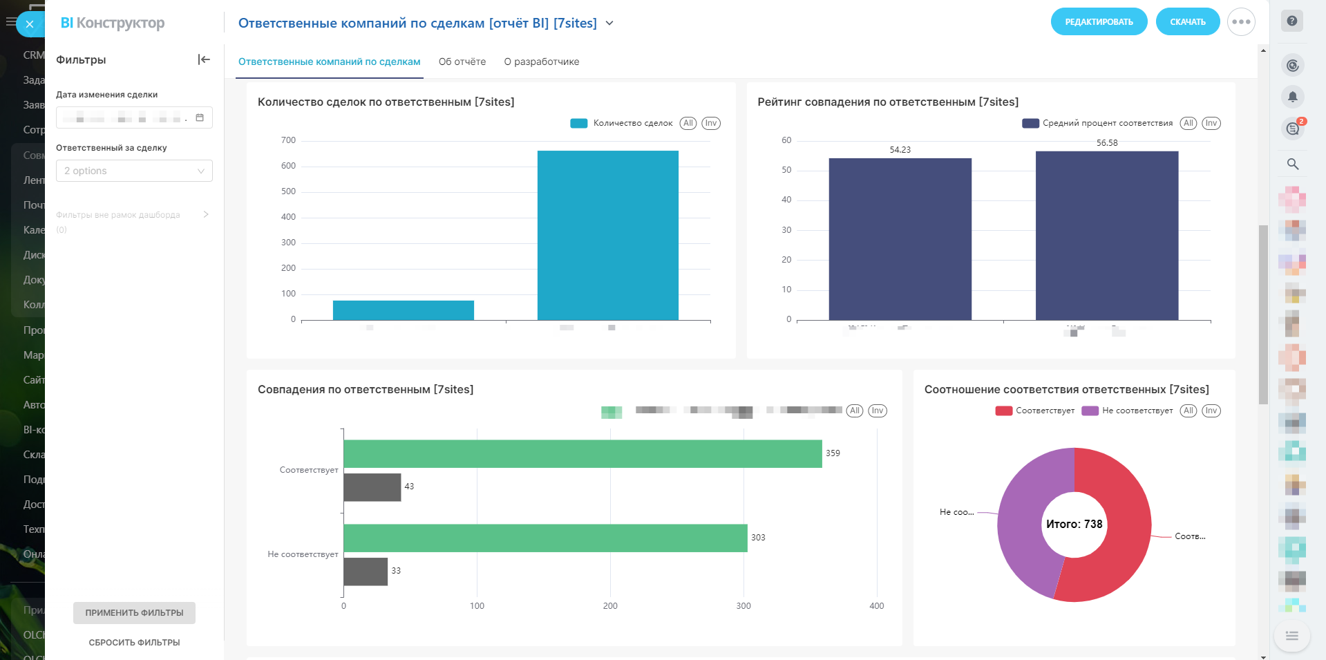Отчёт сравнивает ответственных у взаимозависимых сделок и компаний. Если ответственный за сделку отличен от ответственного за компанию, тогда такой паре сделка-компания присваивается 0. Если ответственные совпадают, то 1. В итоге мы получаем процент соответствия по всей компании целиком и в разрезе ответственного.