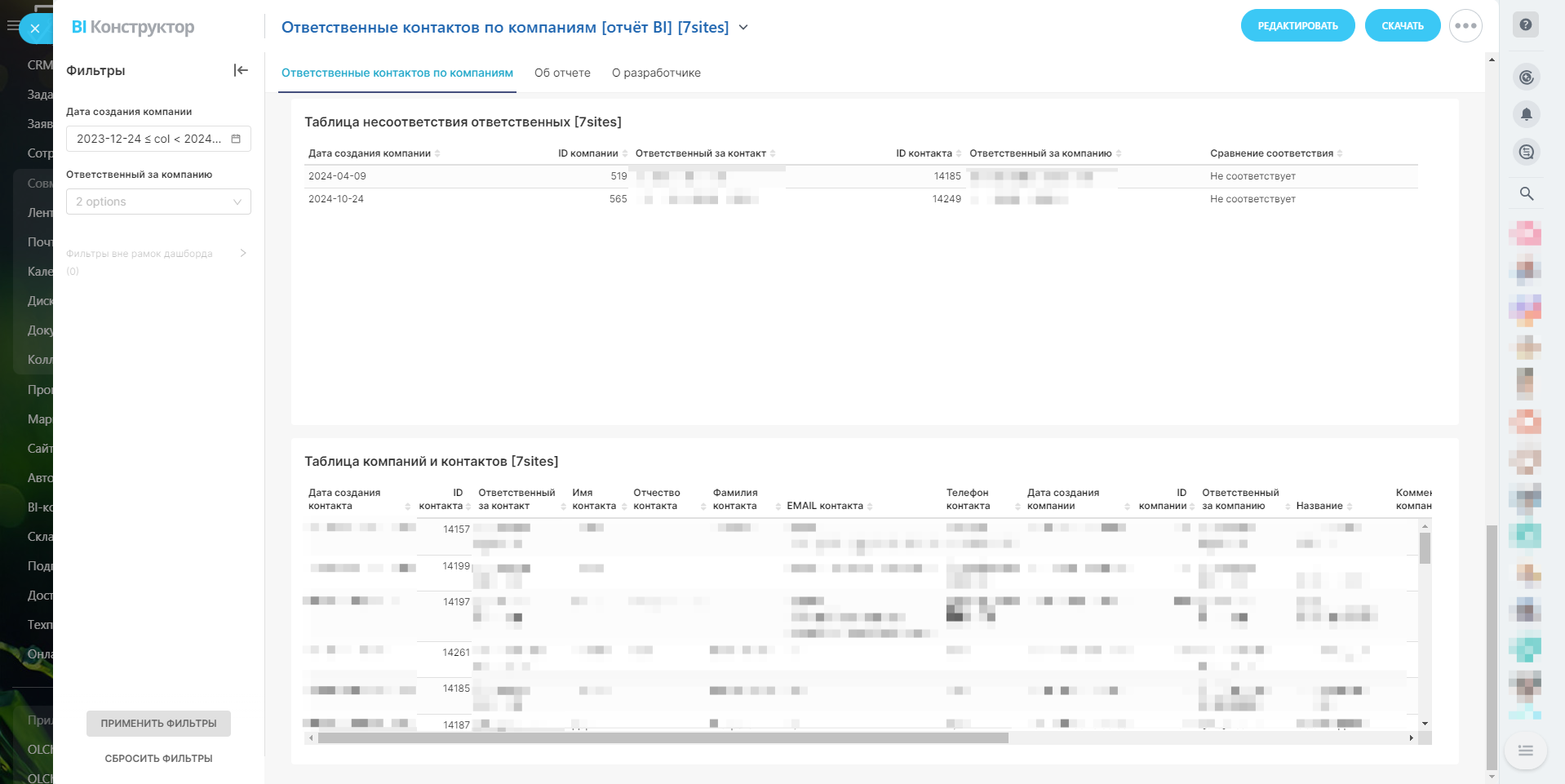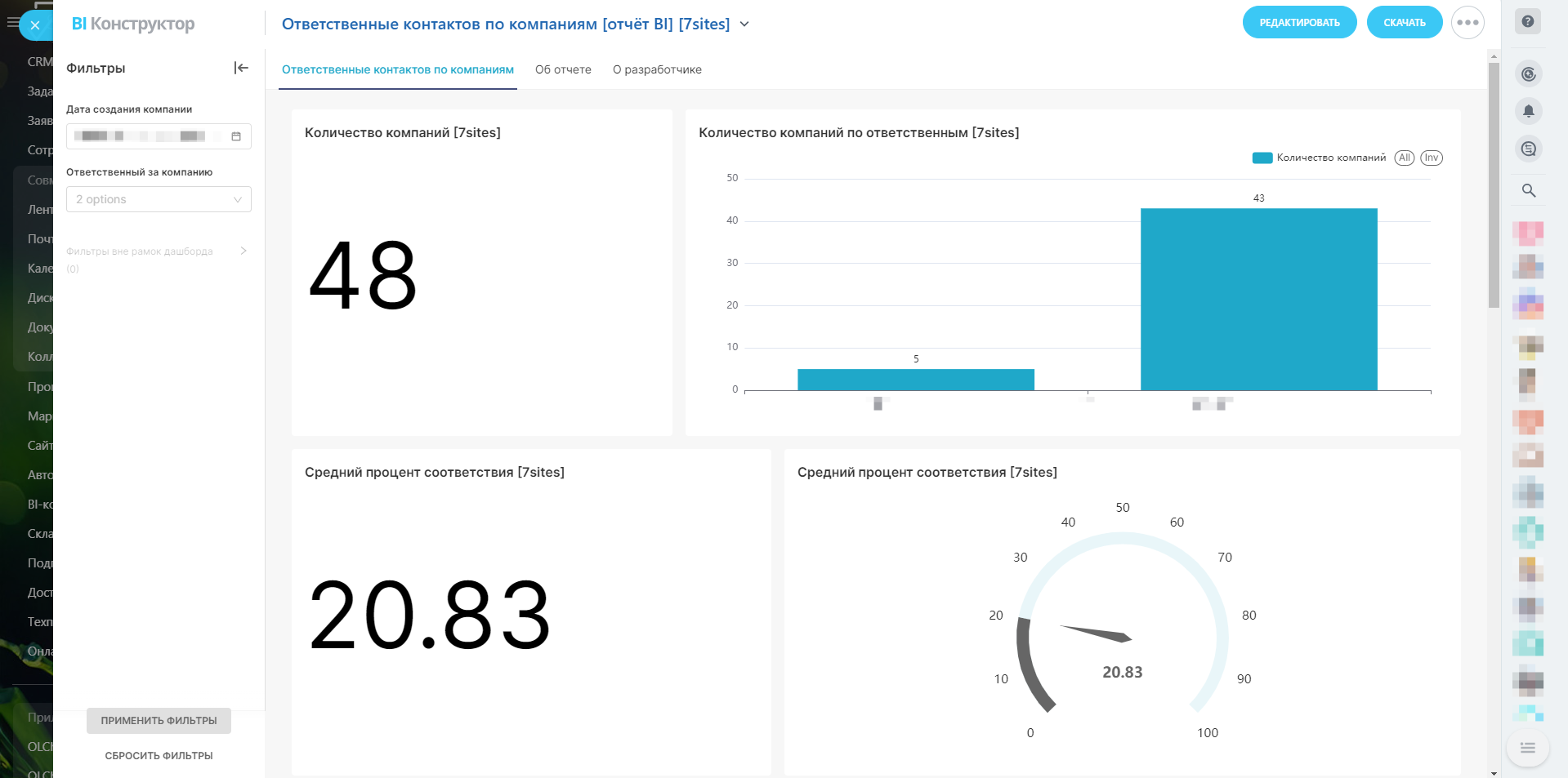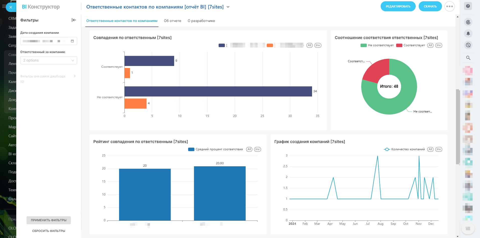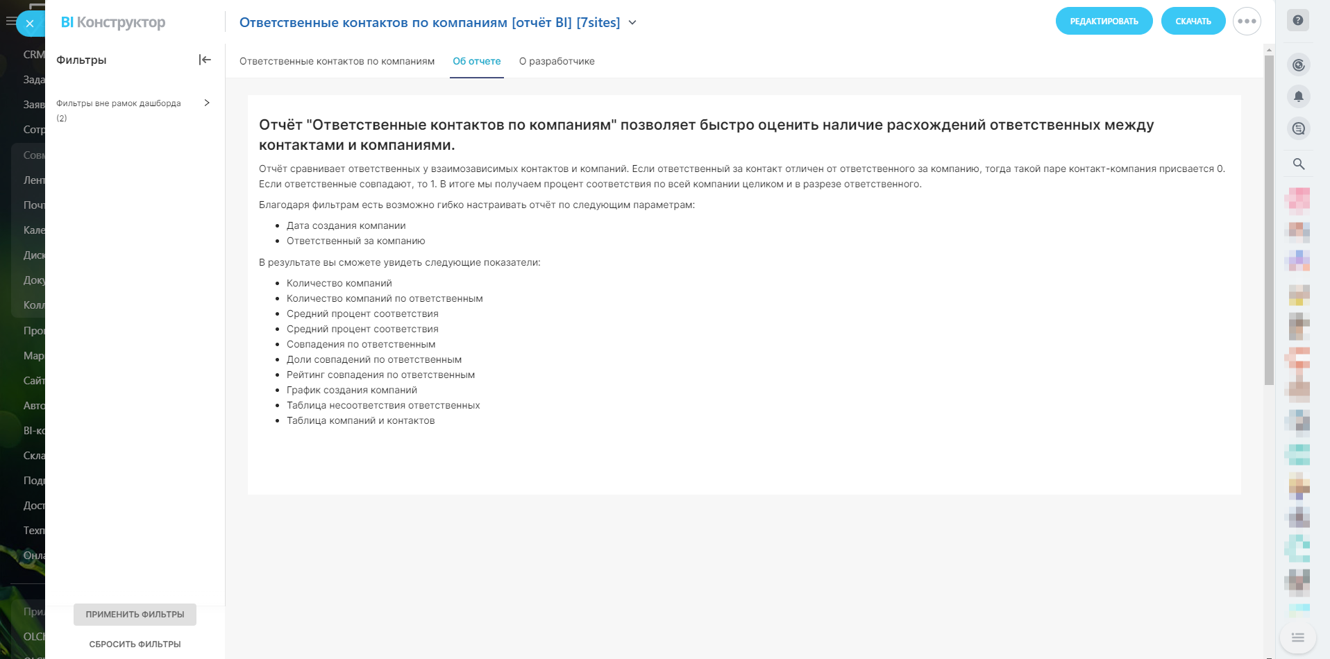 Отчёт сравнивает ответственных у взаимозависимых контактов и компаний. Если ответственный за контакт отличен от ответственного за компанию, тогда такой паре контакт-компания присвается 0. Если ответственные совпадают, то 1. В итоге мы получаем процент соответствия по всей компании целиком и в разрезе ответственного.