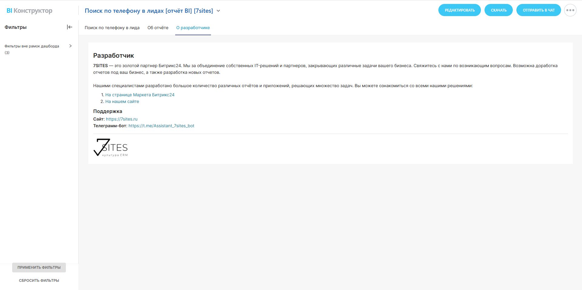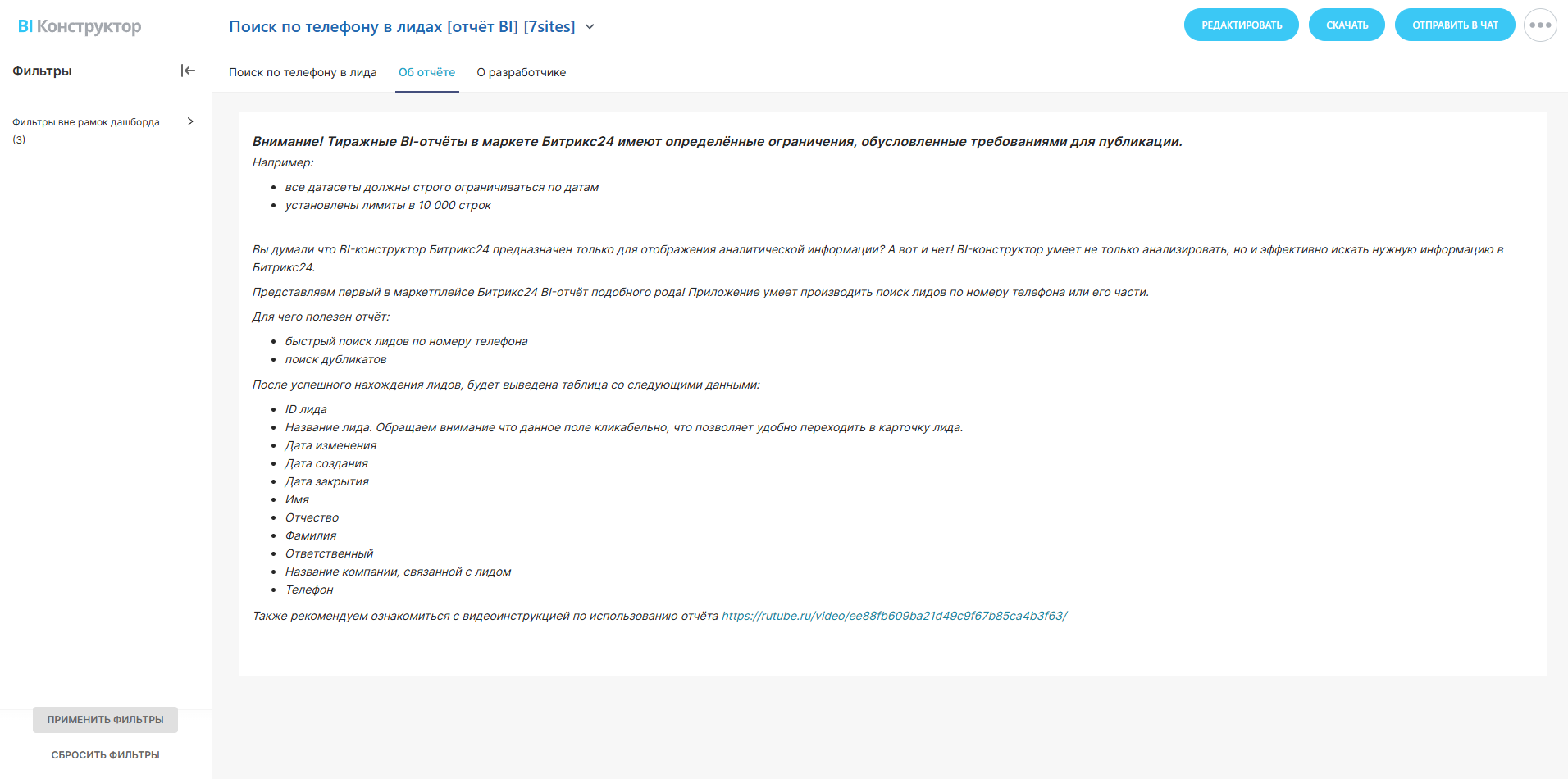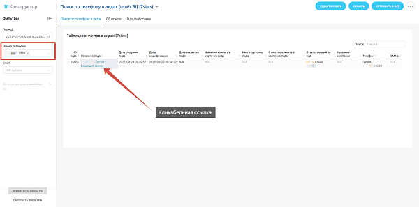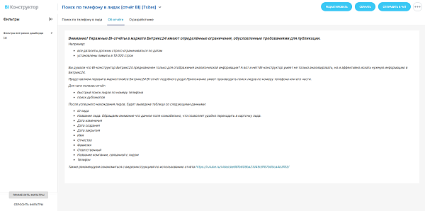 Представляем первый в маркетплейсе Битрикс24 BI-отчёт подобного рода! Приложение умеет производить поиск лидов по номеру телефона или его части.