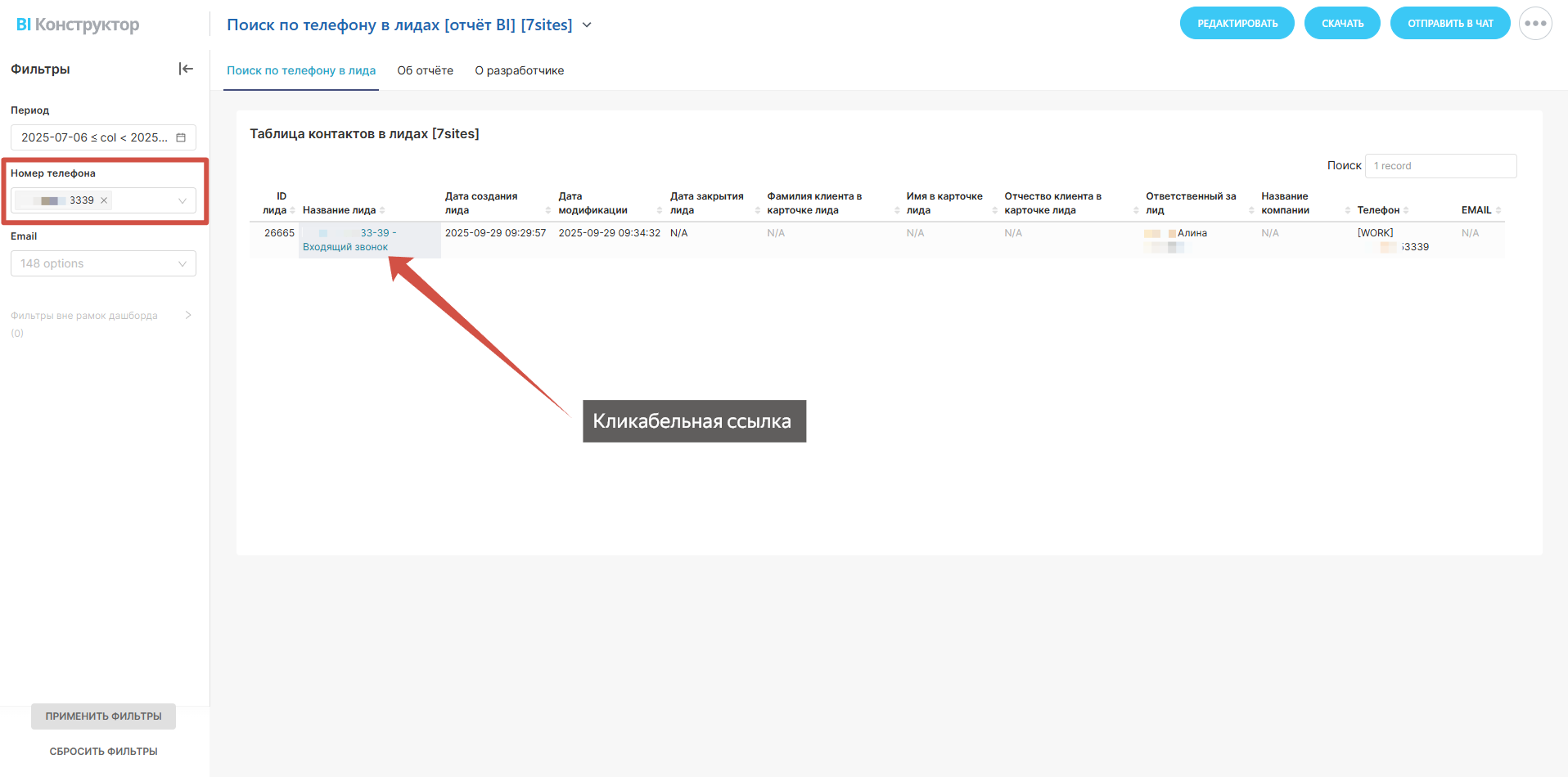 Поиск по телефону в лидах [отчёт BI]