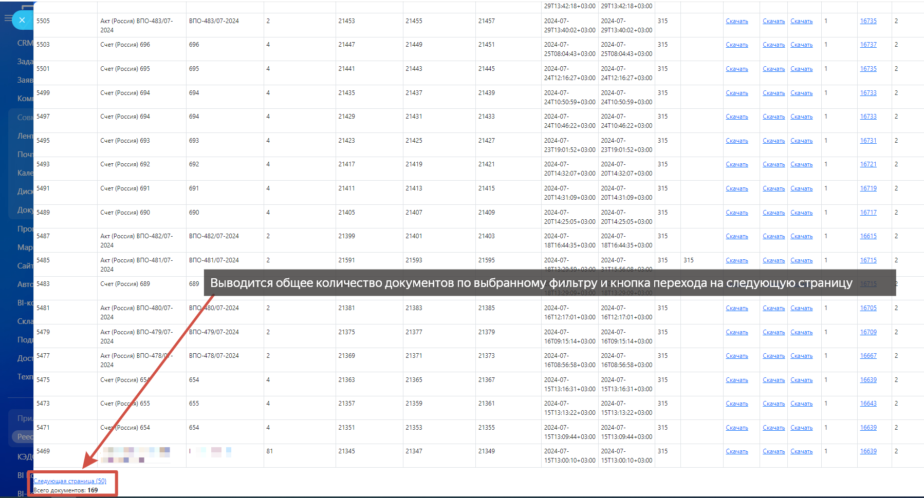 - Если вывод содержит более 50 документов, показывается кнопка для перехода на следующую страницу