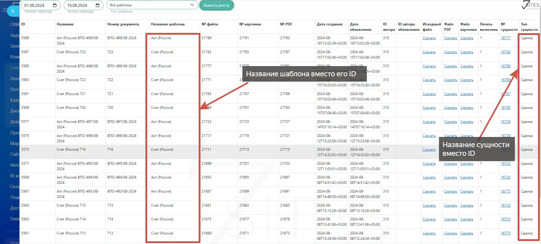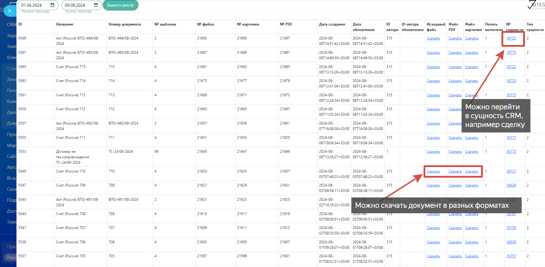 - Прямо из реестра можно перейти в сущность CRM, в которой сгенерирован документ