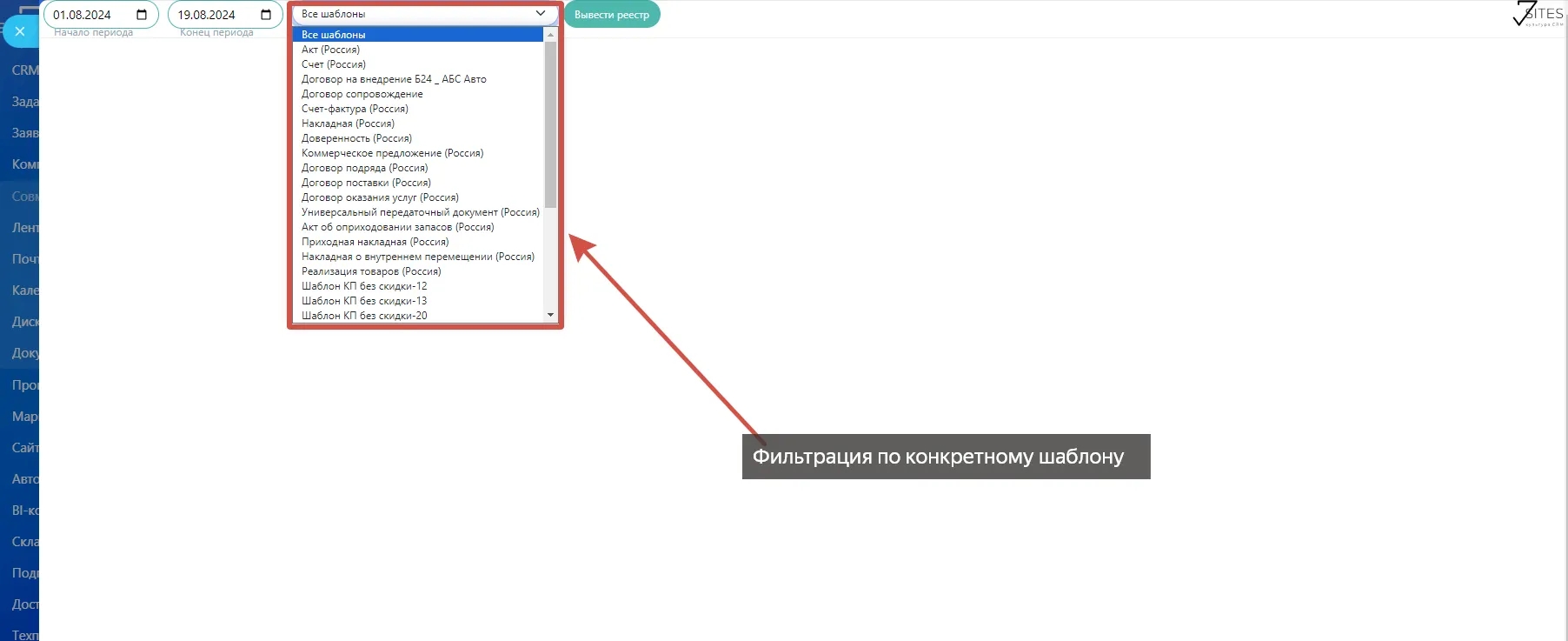 - Фильтрация по шаблону документа. Например, вывести только акты или только счета.
