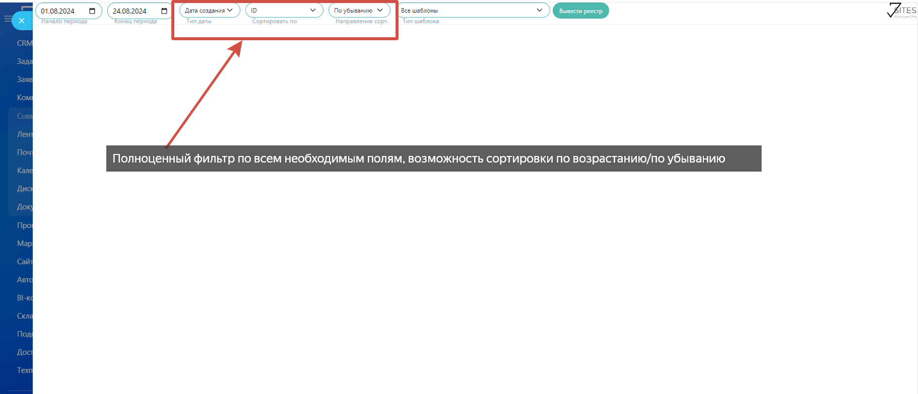 - Сортировка по возрастанию/убыванию по следующим полям: ID, Название, Номер документа, Шаблон, ID автора, ID автора обновления