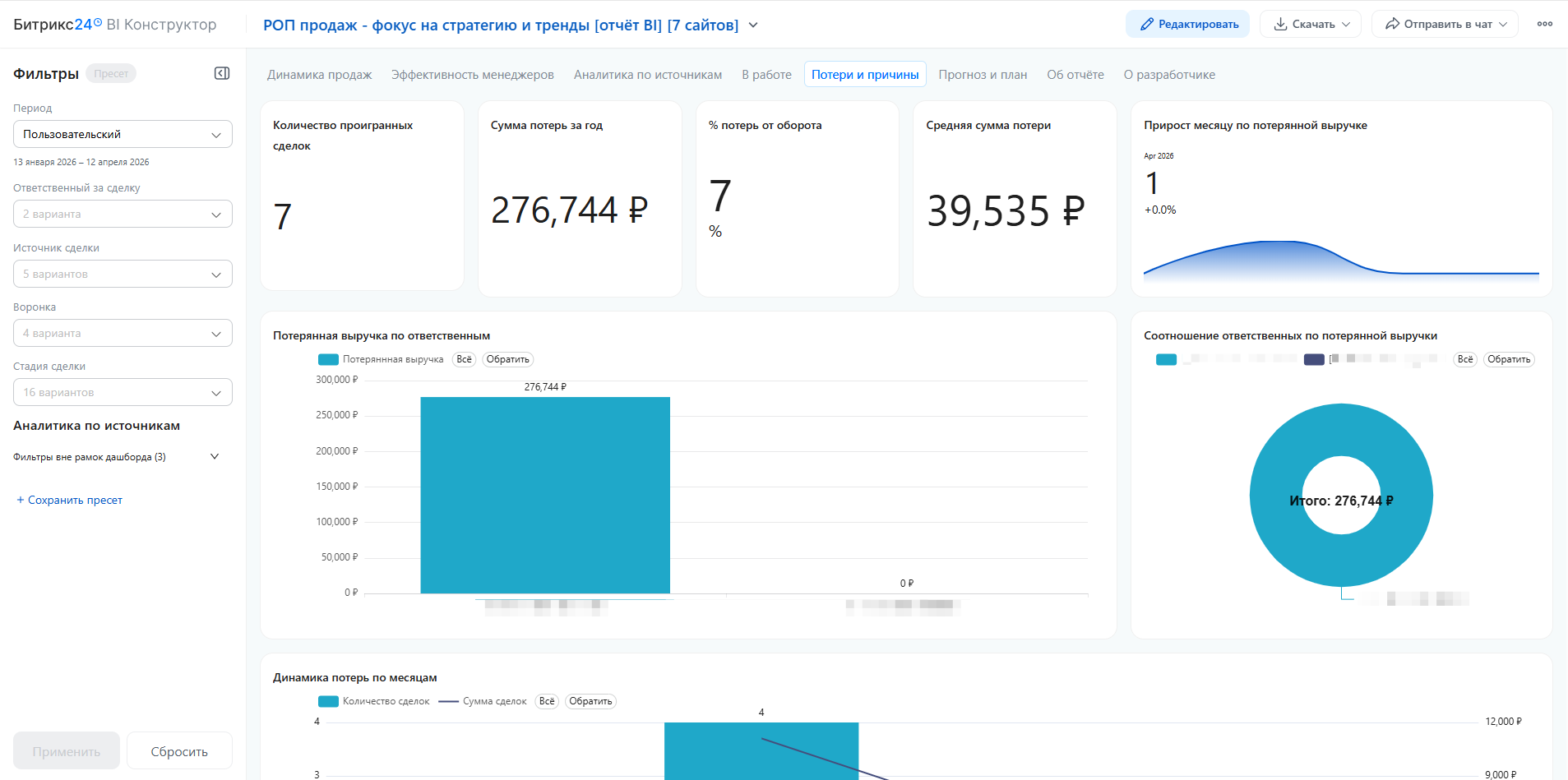 - Потери и причины — сколько денег упало из воронки, на каких стадиях и по чьей вине. Чтобы не наступать на одни и те же грабли.