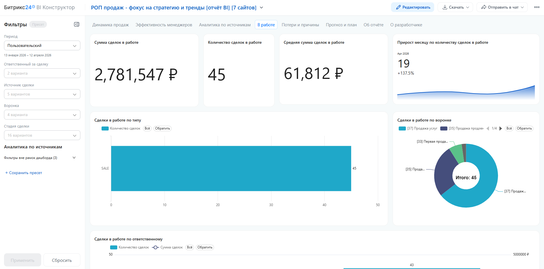 - Контроль над «в работе» — сумма и количество сделок, которые ещё не закрыты. Чтобы видеть потенциал и не терять крупные контракты.