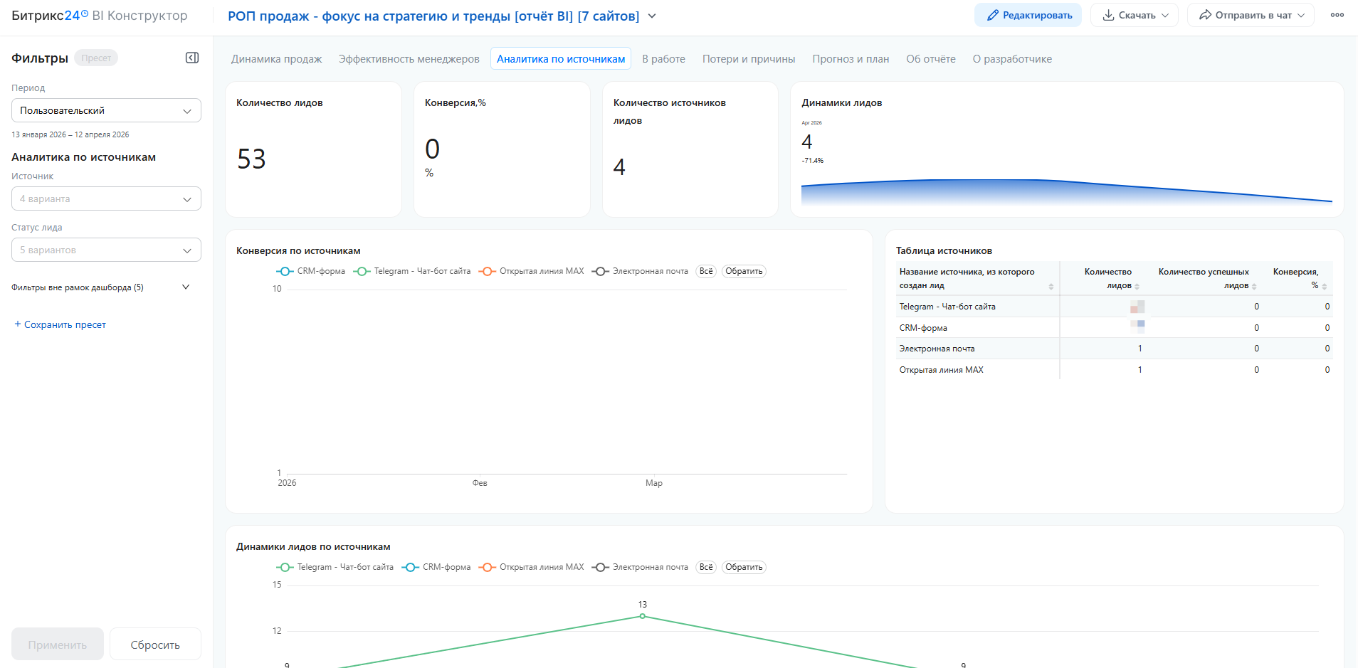 - Аналитику по источникам — откуда приходят лиды и где конверсия нулевая. Чтобы не сливать бюджет на каналы, которые не работают.