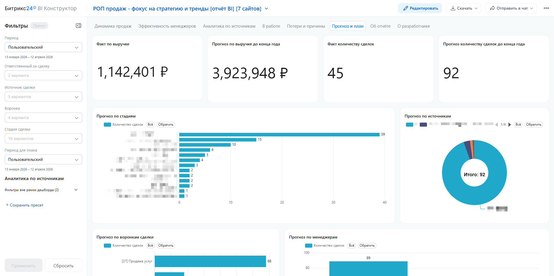 - Прогноз до конца года — по выручке, сделкам, менеджерам, источникам. Чтобы принимать решения заранее, а не постфактум.