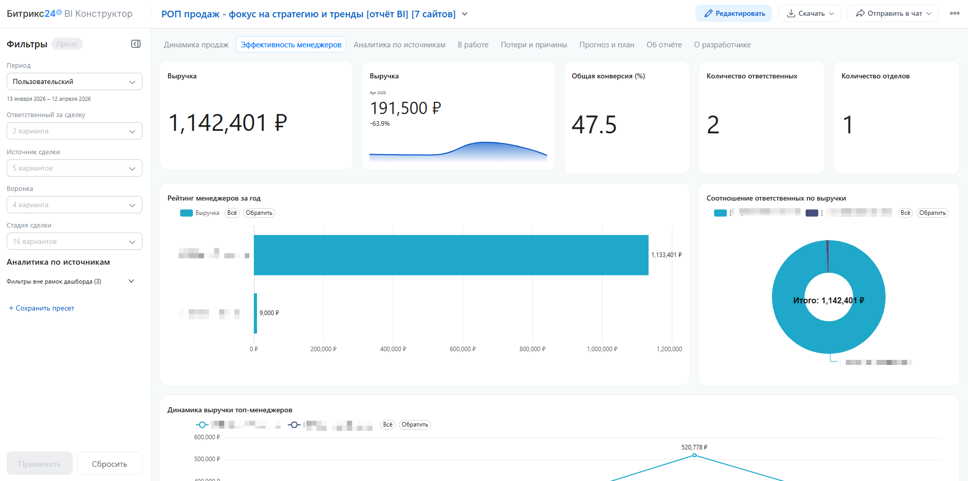 - Рейтинг и эффективность менеджеров — кто сколько заработал, у кого выше конверсия, а кто в «мёртвой зоне» матрицы выручка vs конверсия. Основа для KPI и премий.