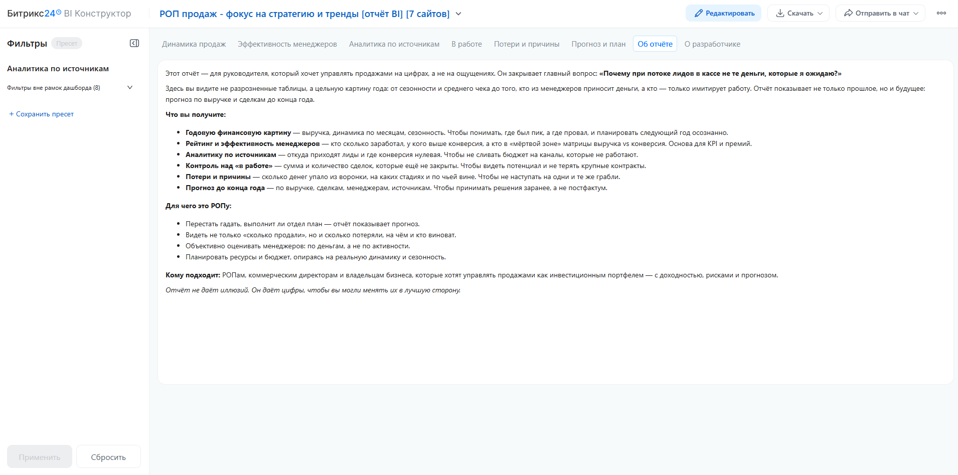 Этот отчёт — для руководителя, который хочет управлять продажами на цифрах, а не на ощущениях. Он закрывает главный вопрос: «Почему при потоке лидов в кассе не те деньги, которые я ожидаю?»