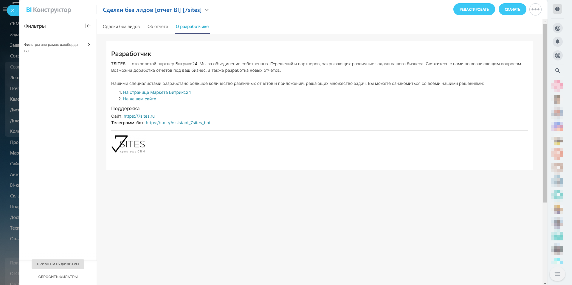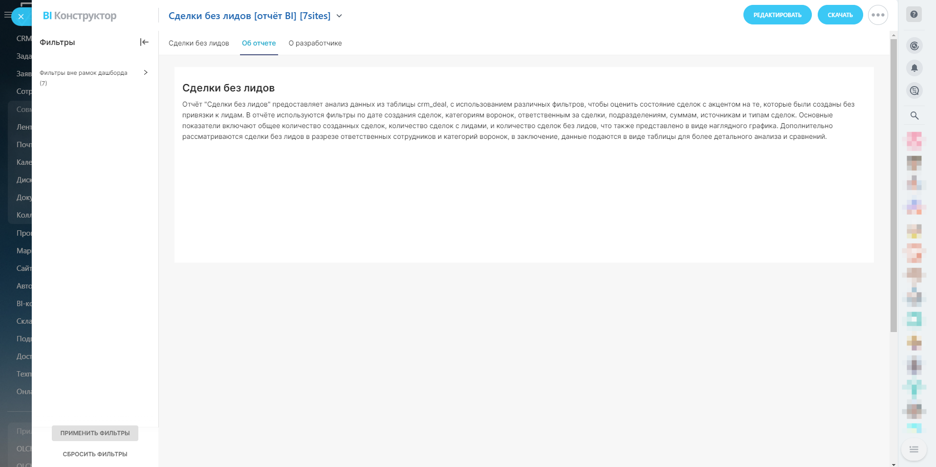 Отчёт "Сделки без лидов" предоставляет анализ данных из таблицы crm_deal, с использованием различных фильтров, чтобы оценить состояние сделок с акцентом на те, которые были созданы без привязки к лидам. В отчёте используются фильтры по дате создания сделок, категориям воронок, ответственным за сделки, подразделениям, суммам, источникам и типам сделок. Основные показатели включают общее количество созданных сделок, количество сделок с лидами, и количество сделок без лидов, что также представлено в виде наглядного графика. Дополнительно рассматриваются сделки без лидов в разрезе ответственных сотрудников и категорий воронок, в заключение, данные подаются в виде таблицы для более детального анализа и сравнений.