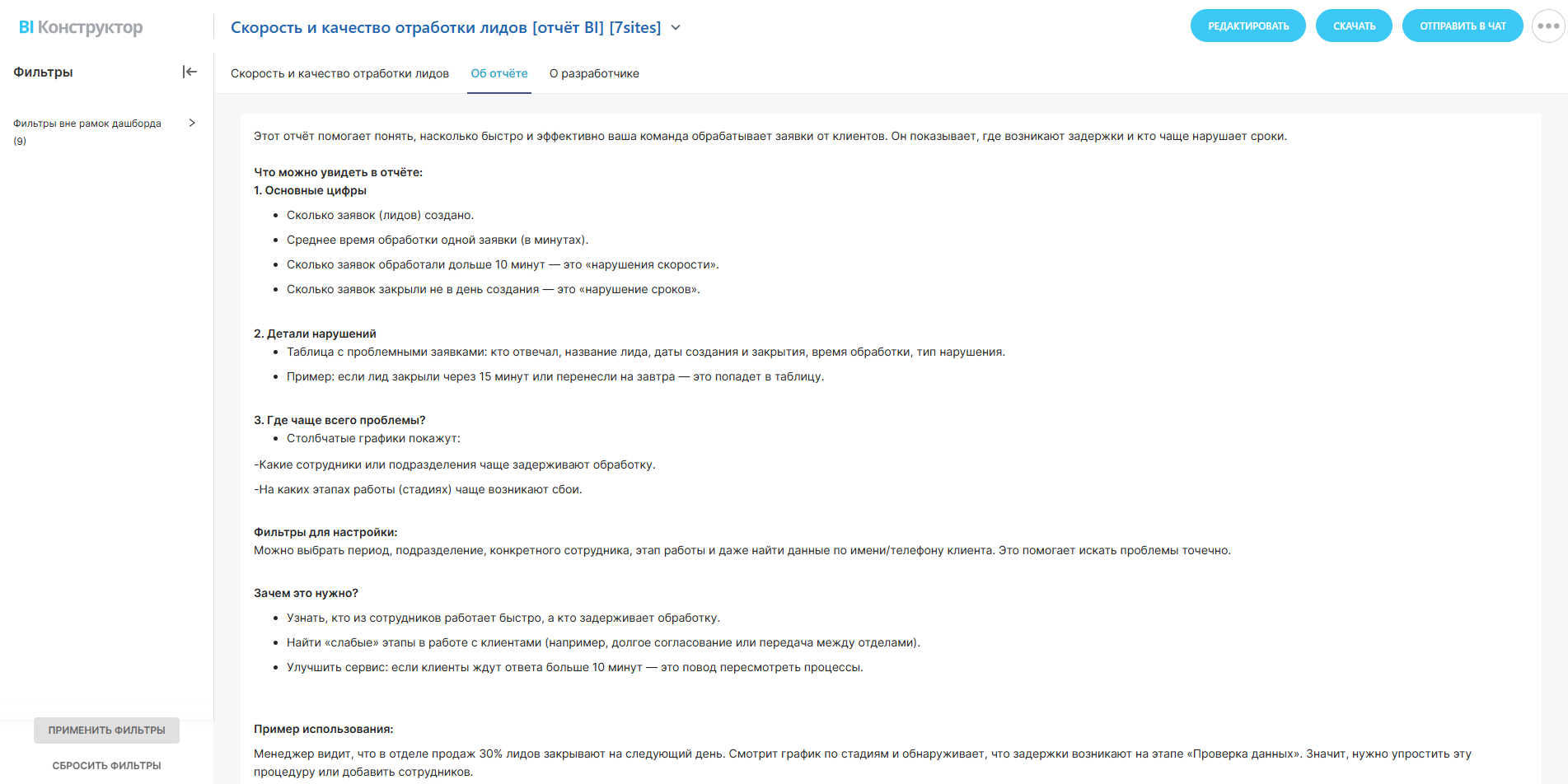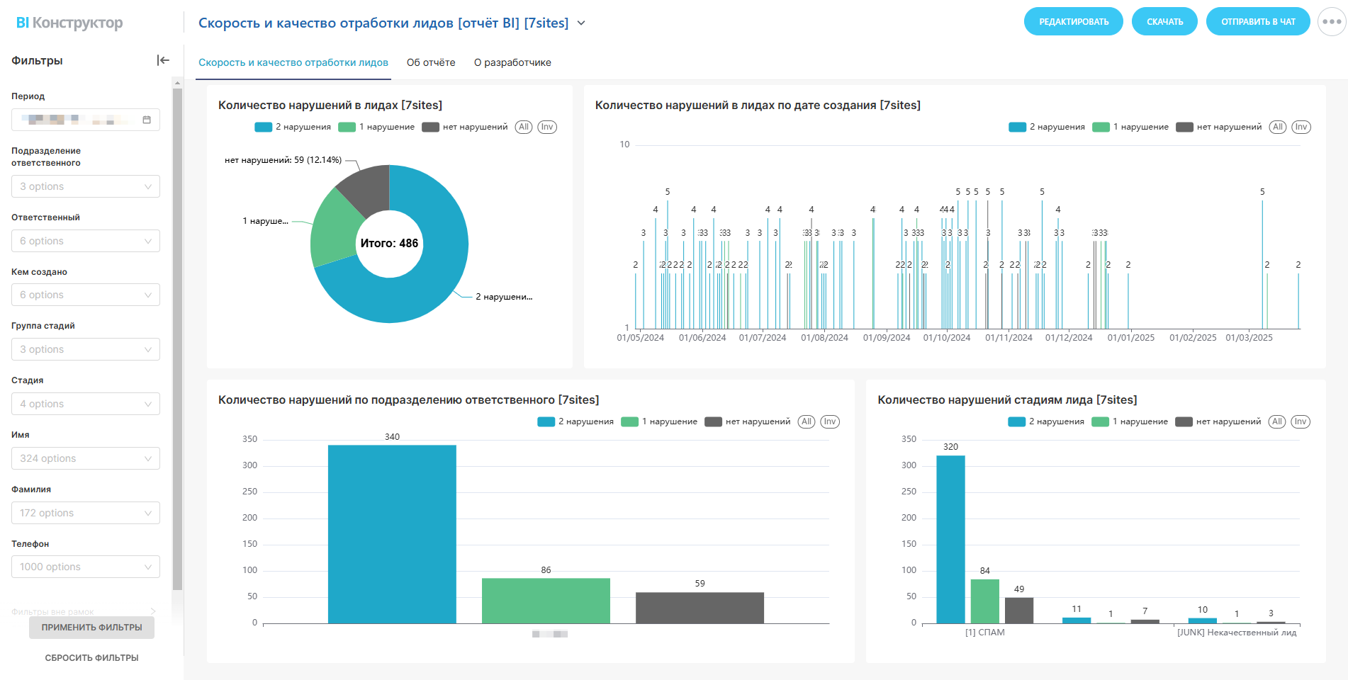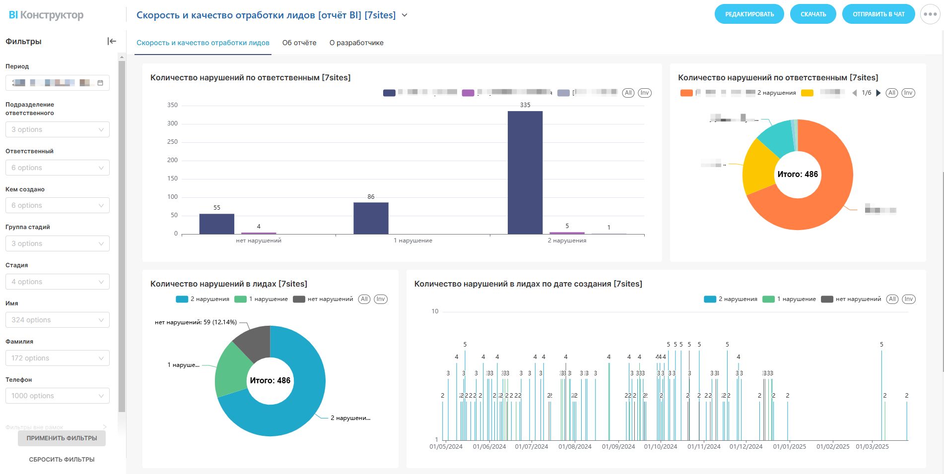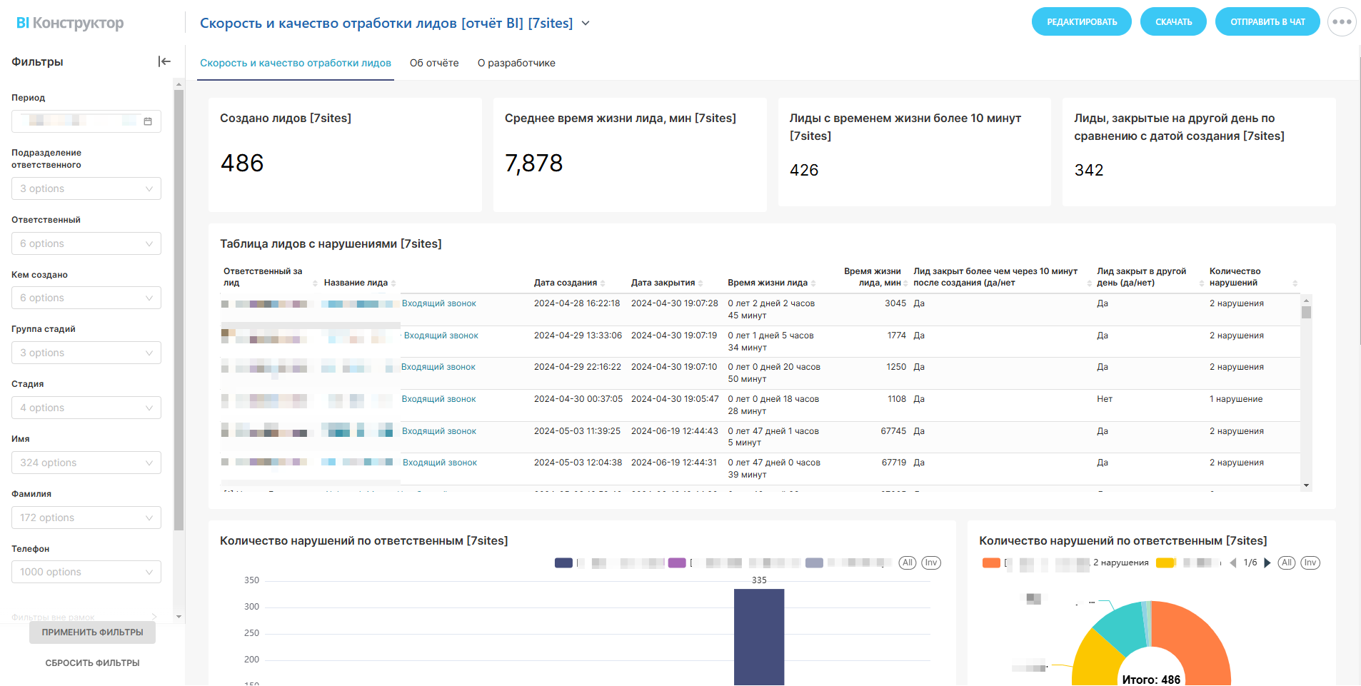 - Таблица с проблемными заявками: кто отвечал, название лида, даты создания и закрытия, время обработки, тип нарушения.