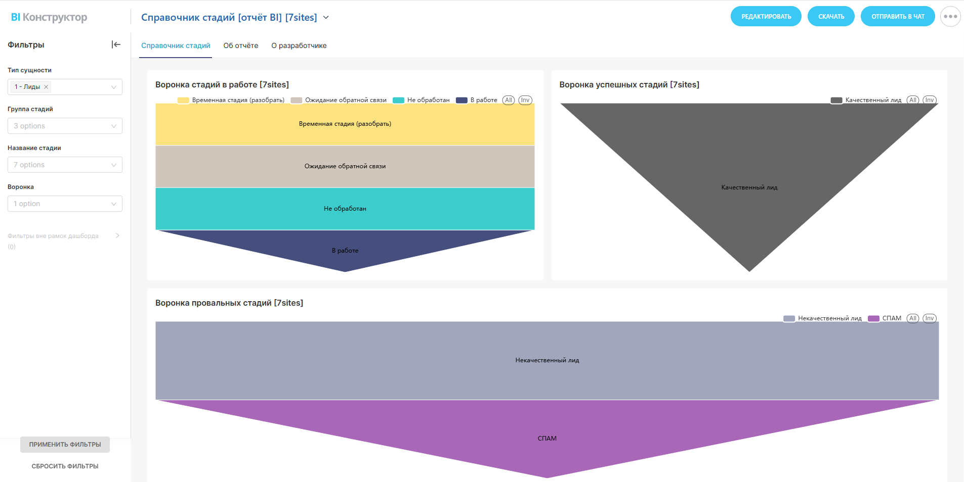Доступны фильтры, которые позволяют сделать выборку только по нужным стадиям