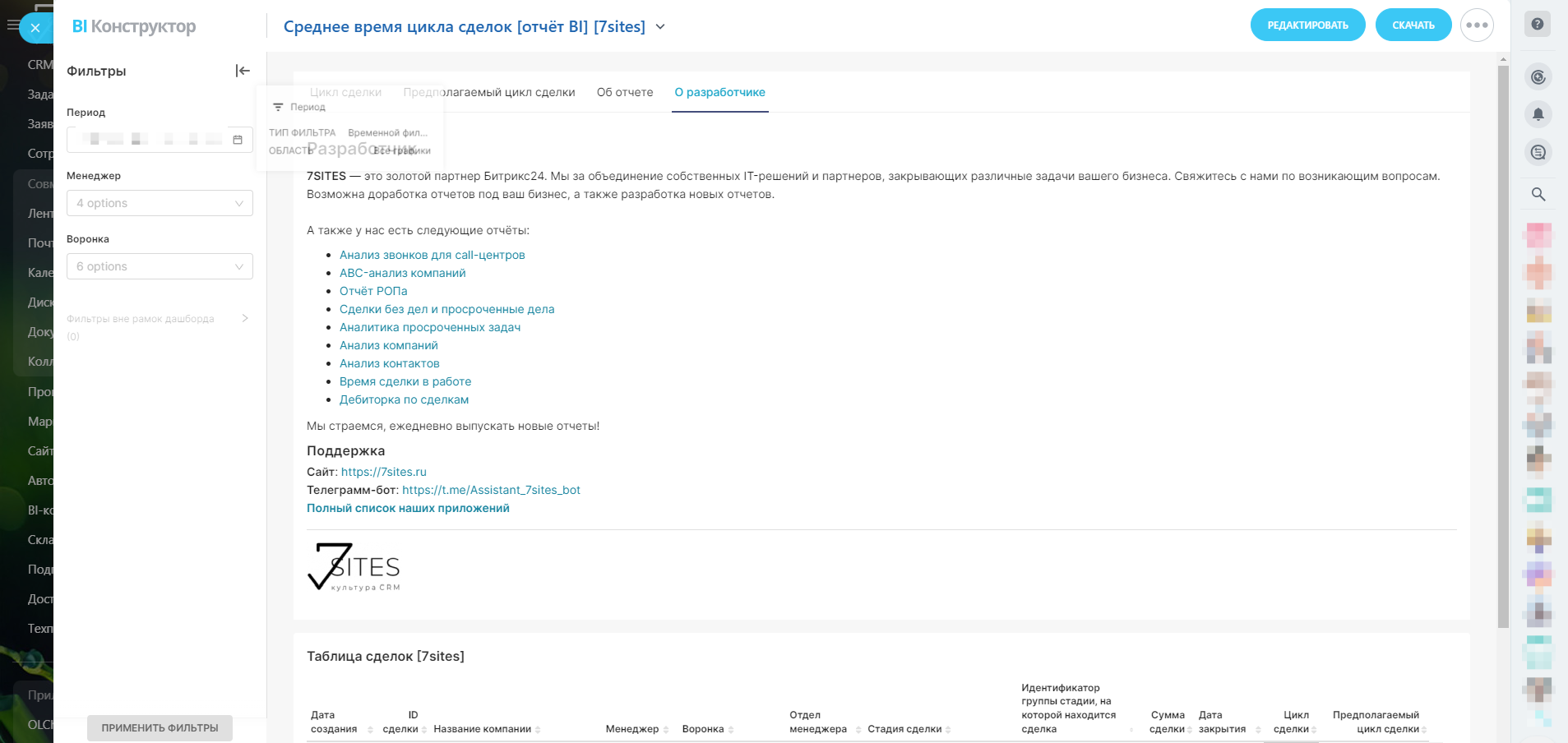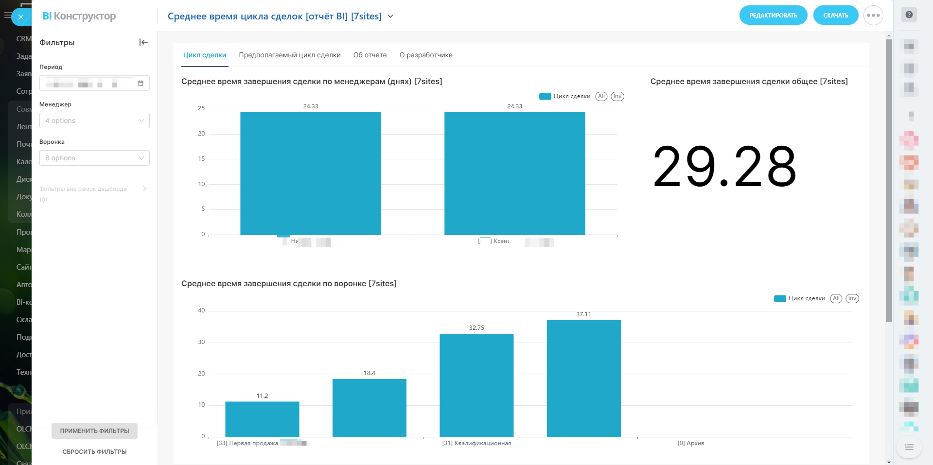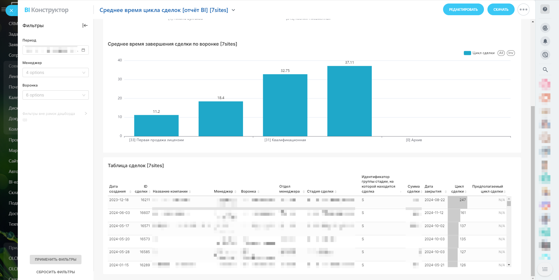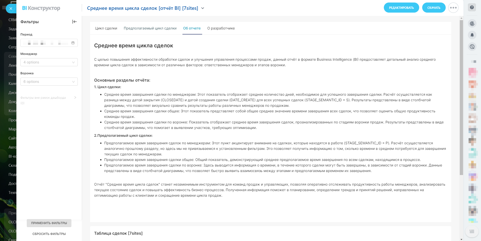 С целью повышения эффективности обработки сделок и улучшения управления процессами продаж, данный отчёт в формате Business Intelligence (BI) предоставляет детальный анализ среднего времени цикла сделок в зависимости от различных факторов: ответственных менеджеров и этапов воронки.