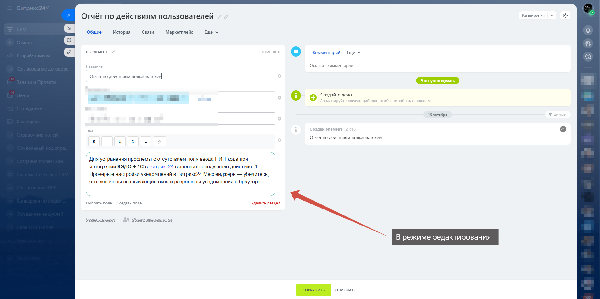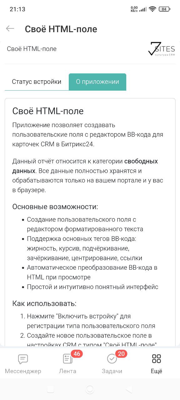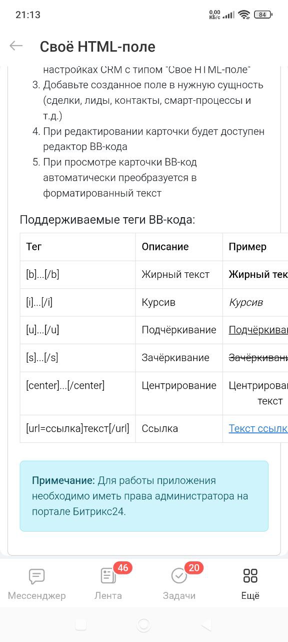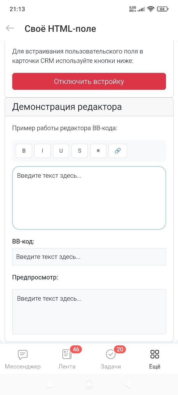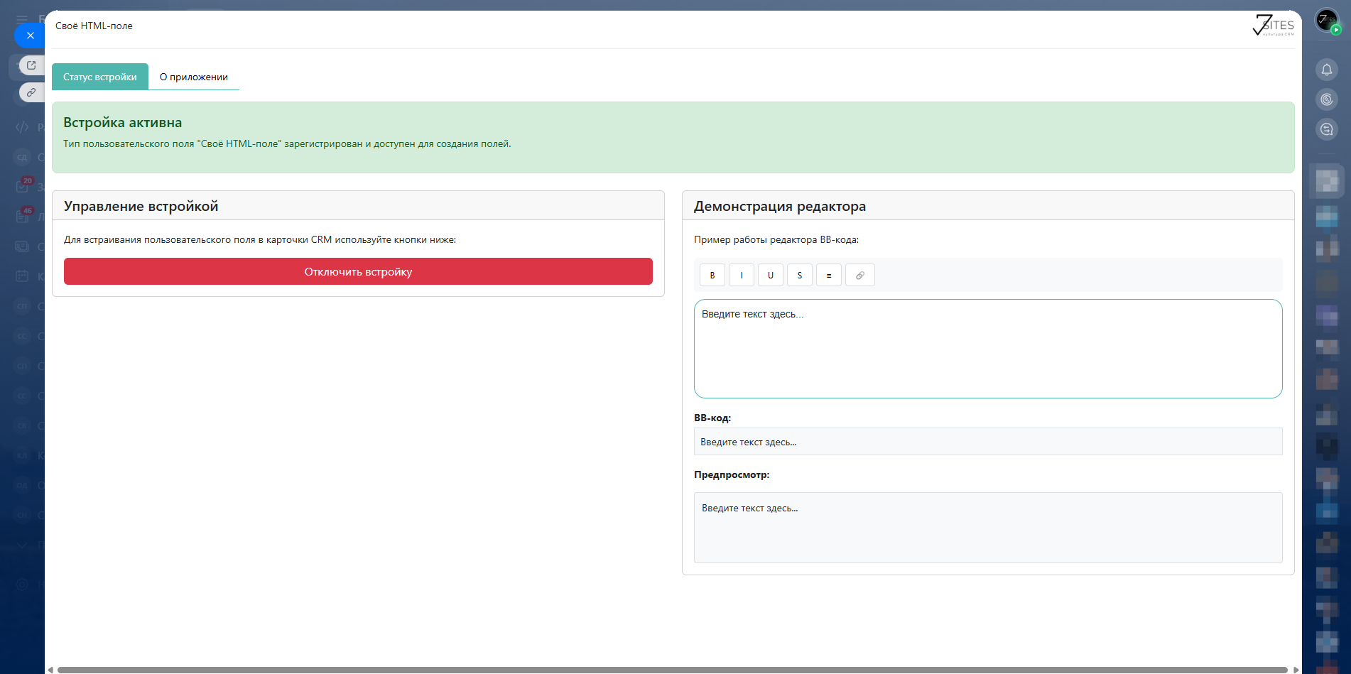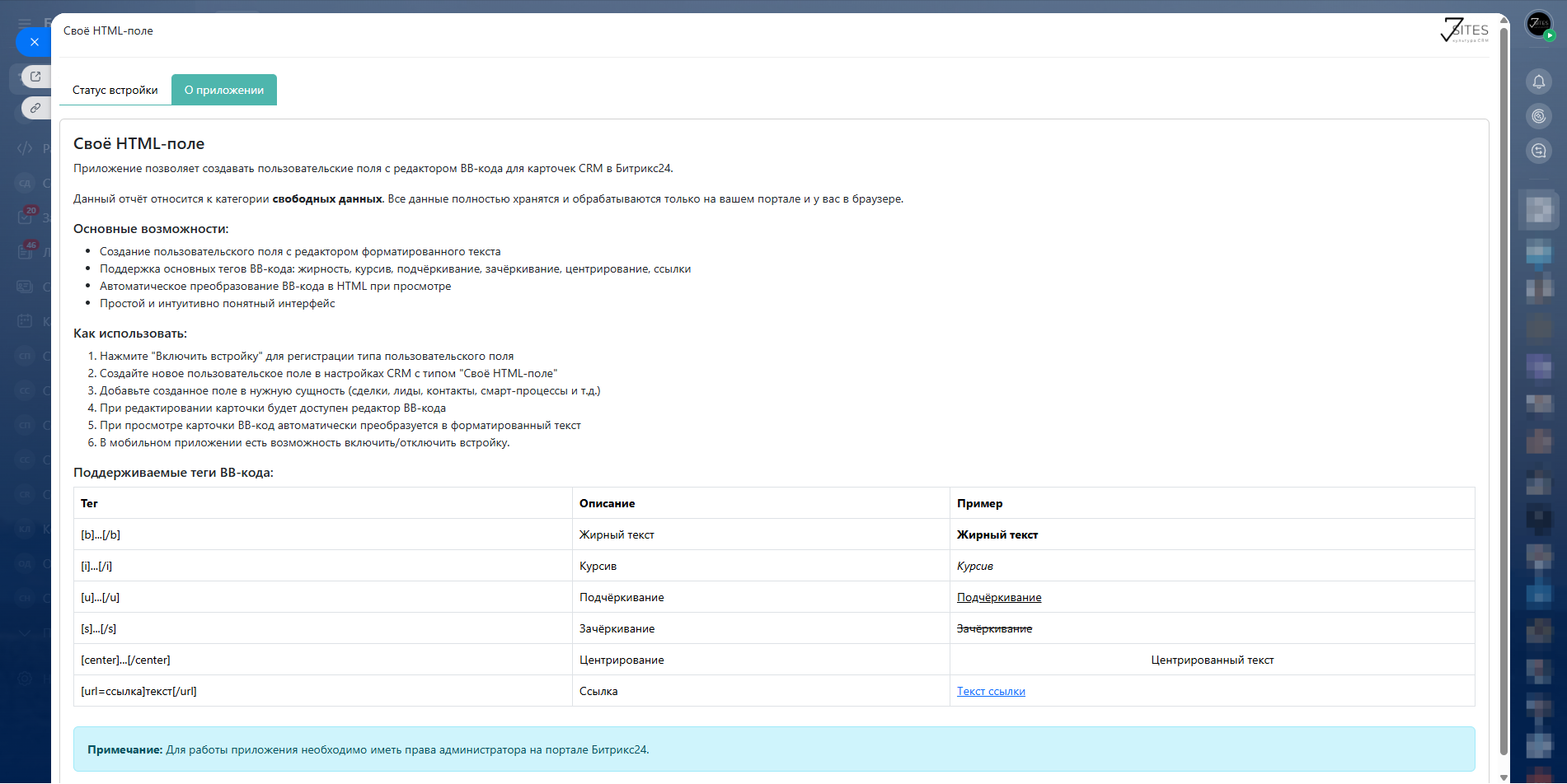 Приложение позволяет создавать пользовательские поля с редактором BB-кода для карточек CRM в Битрикс24.