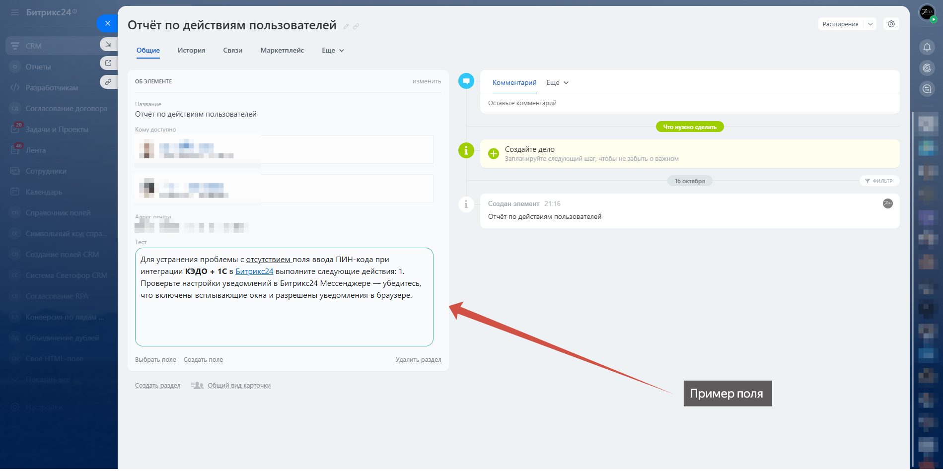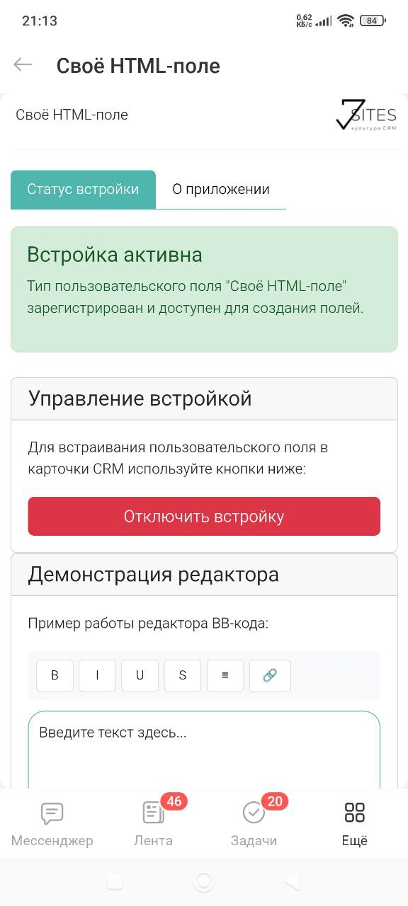- Создайте новое пользовательское поле в настройках CRM с типом "Своё HTML-поле"