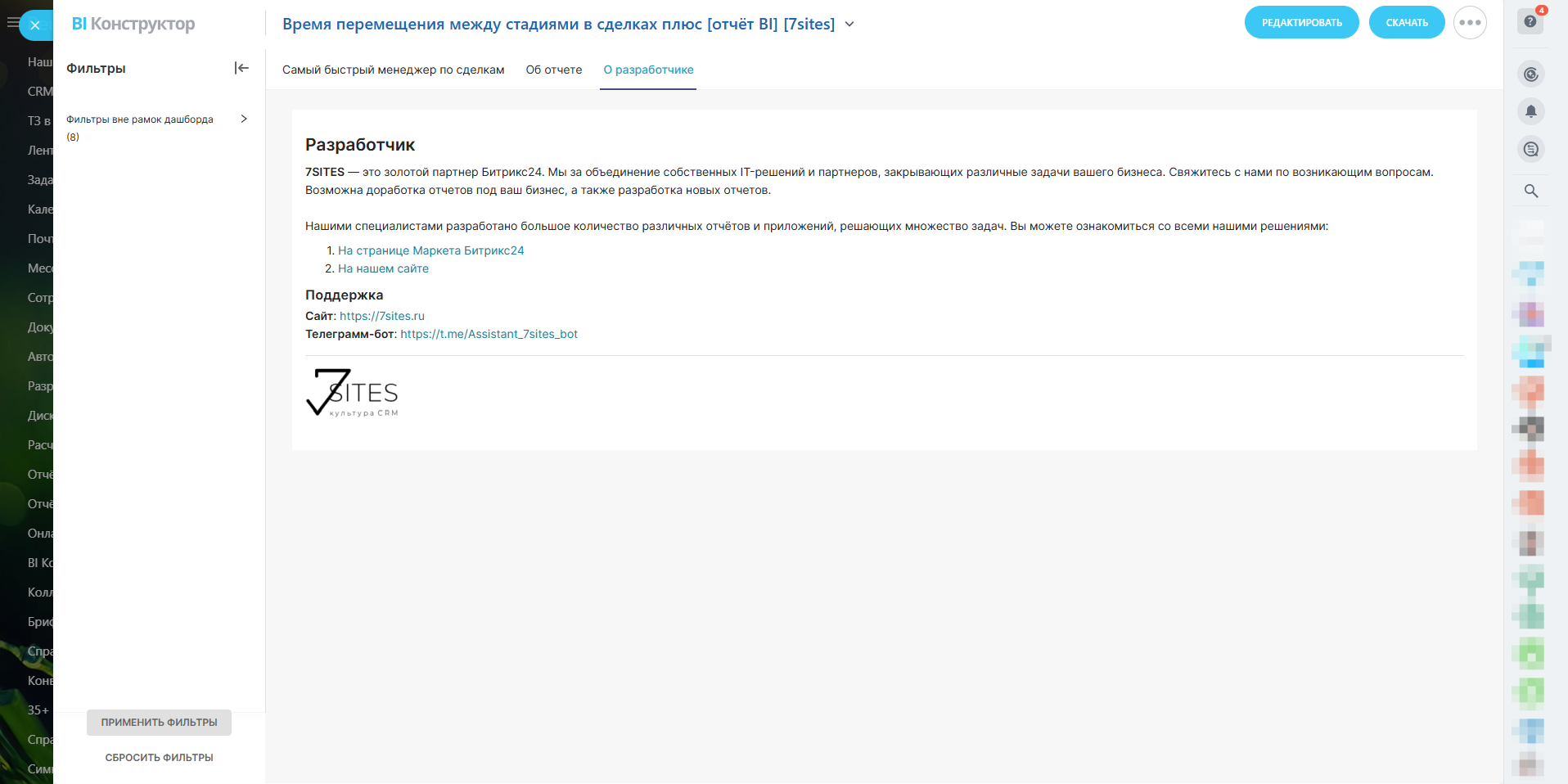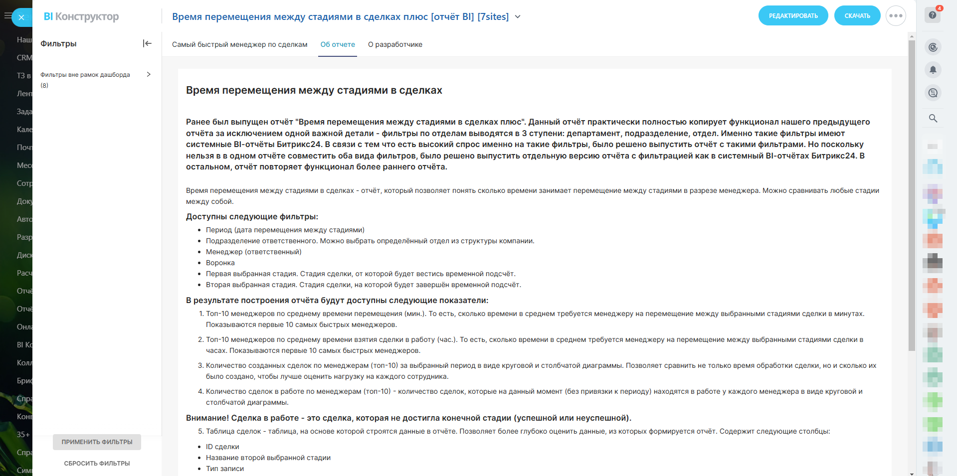 Ранее был выпущен отчёт "Время перемещения между стадиями в сделках плюс". Данный отчёт практически полностью копирует функционал нашего предыдущего отчёта за исключением одной важной детали - фильтры по отделам выводятся в 3 ступени: департамент, подразделение, отдел. Именно такие фильтры имеют системные BI-отчёты Битрикс24. В связи с тем что есть высокий спрос именно на такие фильтры, было решено выпустить отчёт с такими фильтрами. Но поскольку нельзя в в одном отчёте совместить оба вида фильтров, было решено выпустить отдельную версию отчёта с фильтрацией как в системный BI-отчётах Битрикс24. В остальном, отчёт повторяет функционал более раннего отчёта.