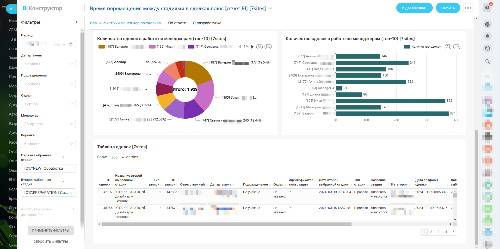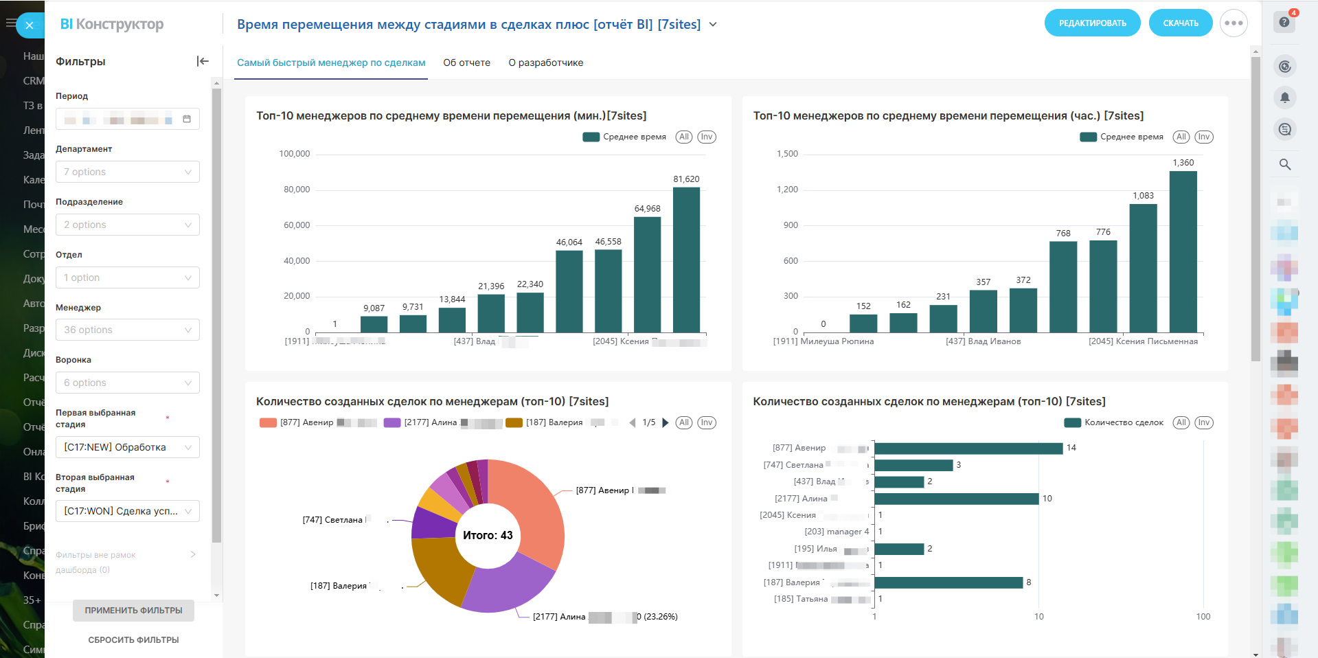Сколько времени занимает перемещение между стадиями в разрезе менеджера с фильтрами по отделам.