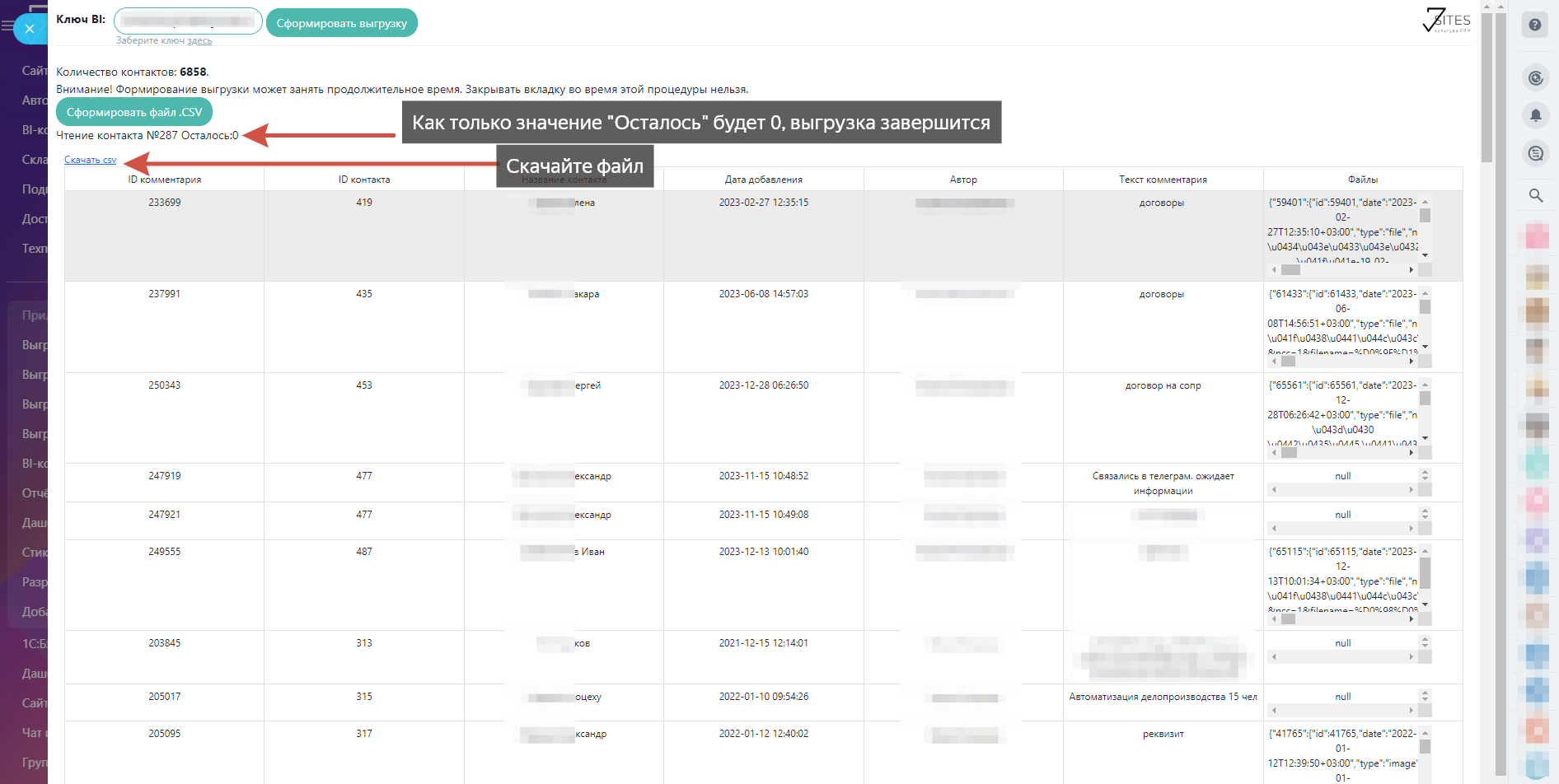 Выгрузка комментариев из контактов