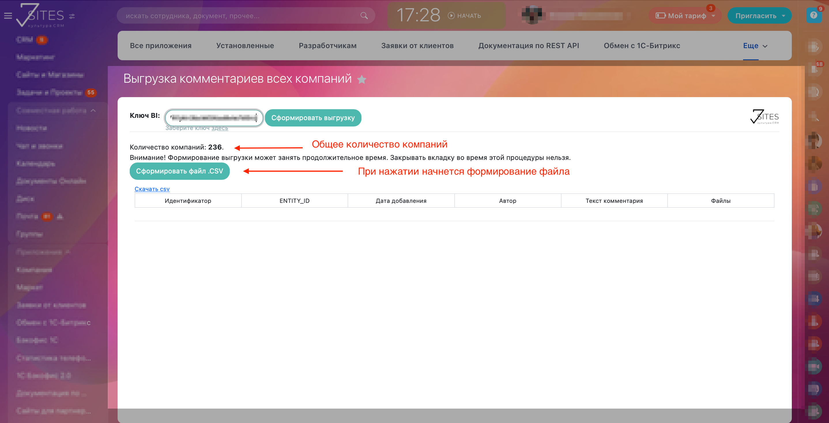После установки приложения в карточке сделки появляется удобная кнопка "Сформировать выгрузку". Просто нажмите на нее, и откроется таблица с полями комментариев. Для сохранения данных в Excel просто кликните на ссылку "Сформировать файл .CSV".